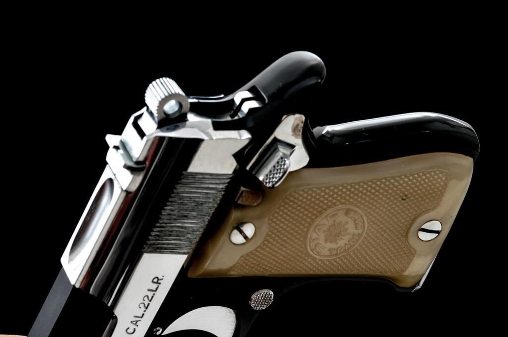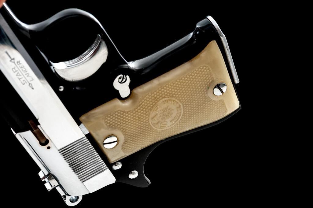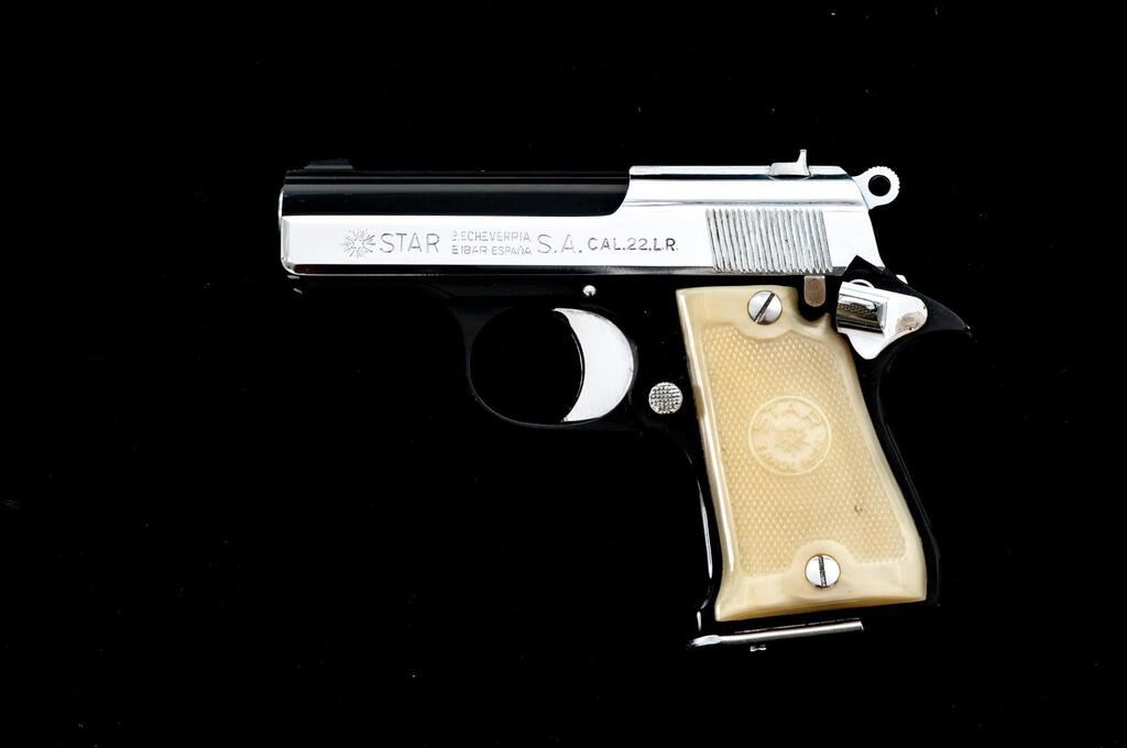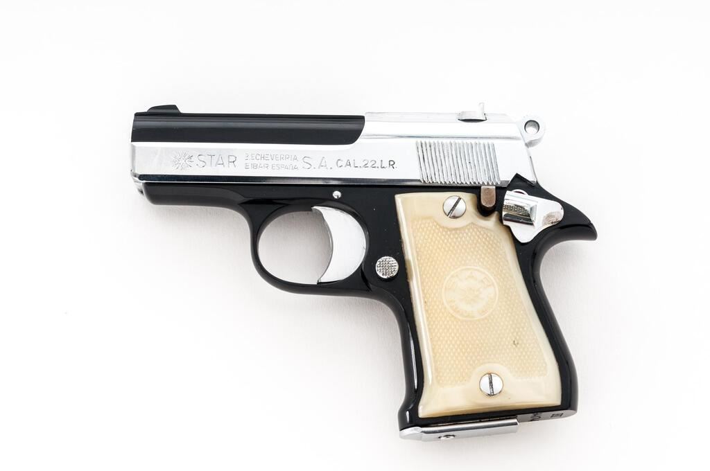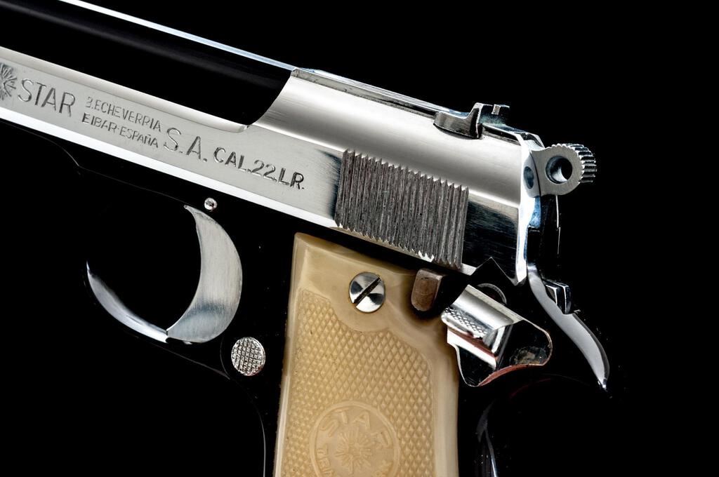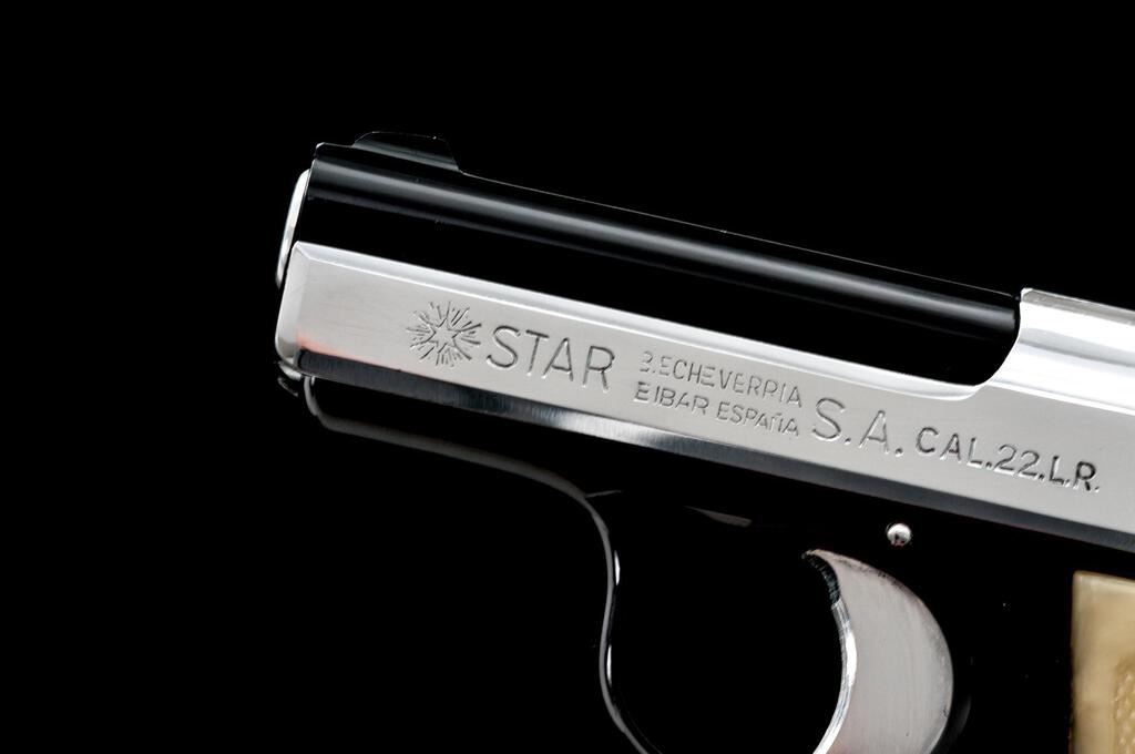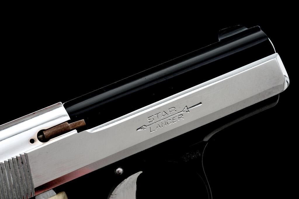 Star Model HK Lancer Semi-Automatic Pistol, #941744, .22 LR cal., 3" barrel, blade front and square-notched fixed rear sights, black frame, polished nickel slide, ringed hammer, checkered plastic two-piece grips, 10-rd. unmarked magazine. Mfg'd from 1955-1968. Pistol is in fine overall condition with light handling marks and a small amount of flaking finish on the safety. Checkered plastic grips are very good and fit well. Action functions well, bore is good. Est.: $200-$400. (C&R/PPT)