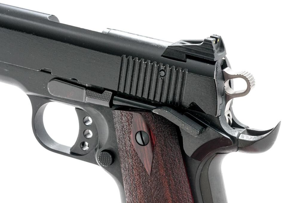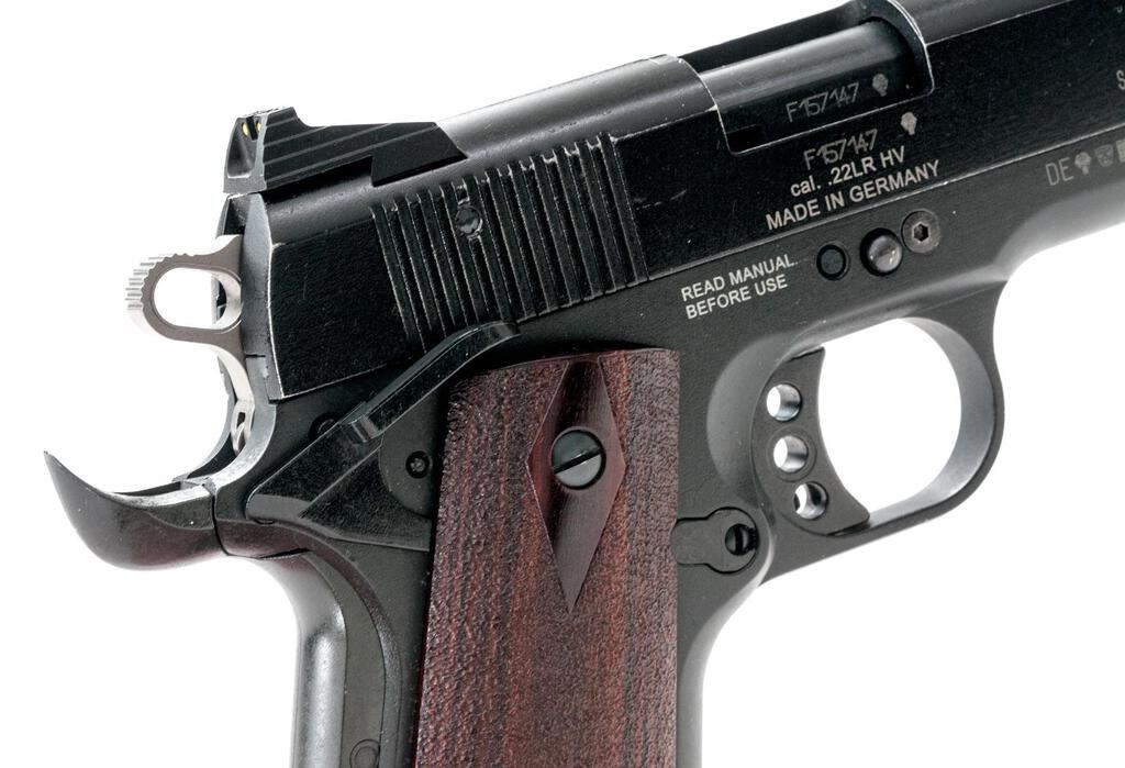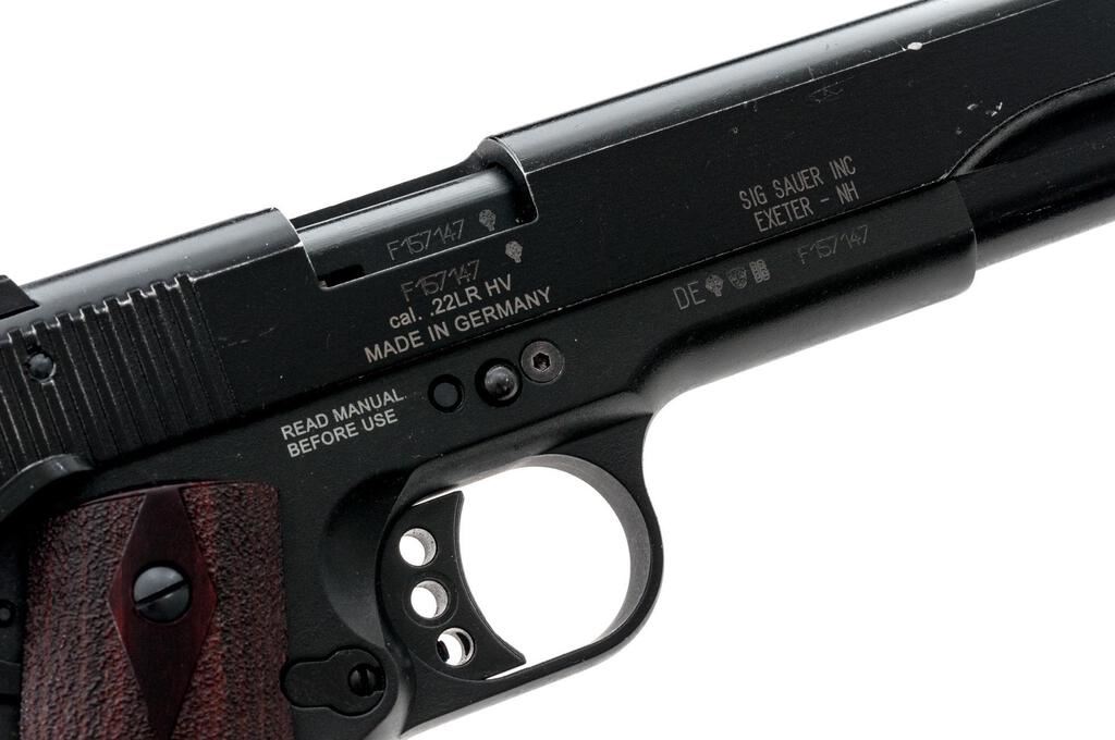 Sig Sauer Model 1991-22 Semi-Automatic Pistol, #F157147, .22 LR cal., 5" barrel with low-profile 3-dot system and adjustable rear sights, bobbed hammer, beavertail safety, matte black finish, Hogue custom two-piece textured rosewood grips, and 10-shot Sig-Sauer marked magazine. Right side of slide is marked "MADE IN GERMANY", and there are numerous German proofs and acceptance marks on the frame, slide and barrel. Mfg'd 2011-2014. Pistol is in very good overall condition retaining approx. 85%-90% matte black finish with scratches and mars, primarily at the muzzle and front of the slide. There is light highpoint edgewear and small scuffs. Grips are in very good condition and fit well. Action is smooth, bore is very good with crisp rifling. Est.: $300-$500. (Modern/PPT)