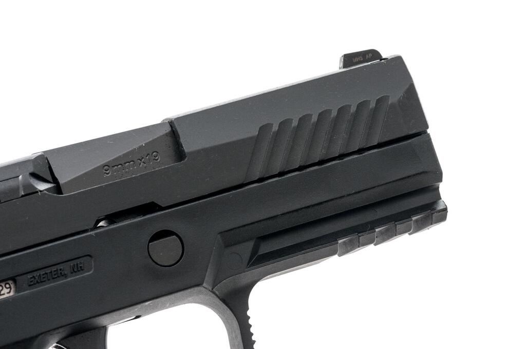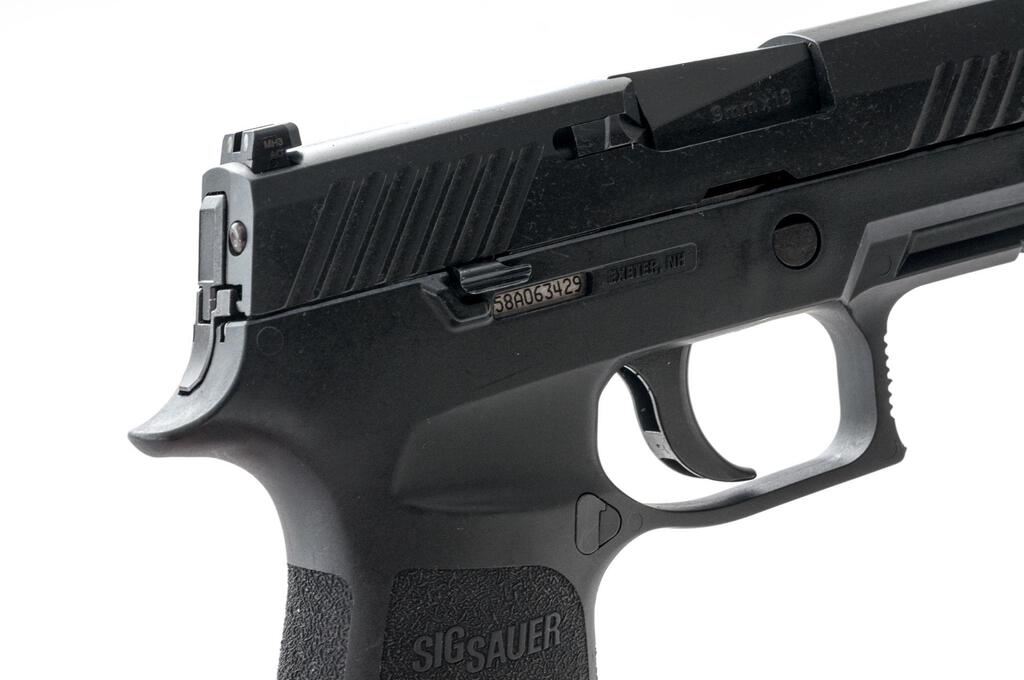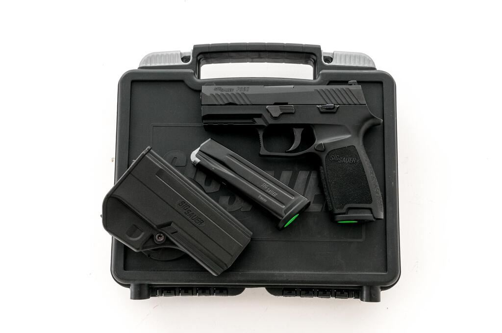 Sig Sauer P320 Carry Semi-Automatic Pistol, #58A063429, 9mm, 3-7/8" barrel, black nitron finished slide, black polymer frame with integral lower accessory rail, 3-dot Siglite night sights, ambidextrous slide release, with two (2) 17-rd. Sig Sauer magazines. In original matching numbered black plastic case with owner's manual, cable lock, and Sig Sauer paddle holster. Condition is excellent, appearing near new. There are a few minor scuffs and handling marks to the frame and slide. Night sights still glow. Smooth like new action. Bore is bright with strong rifling. Est.: $350-$500. (Modern) (Not available to Calif. residents.)