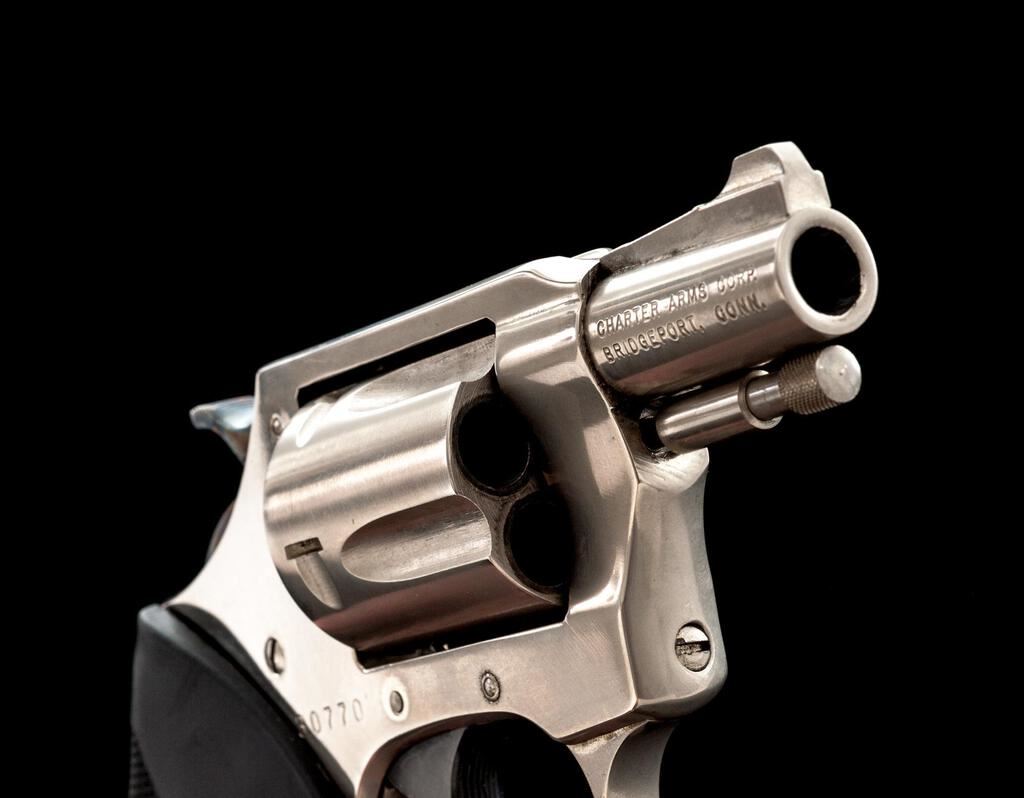 Charter Arms Undercover Double Action Revolver, #30770, .38 Spec. cal., 2" barrel, ramped blade front and square-notched fixed rear sights, stainless steel, checkered rubber one-piece Charter Arms marked combat grips, and 5-shot cylinder. Revolver is in fine overall condition retaining nearly all of its factory finish, with small mars and scuffs consistent with carry and use. Cylinder shows an index line, and the finish is frosting ahead of the cylinder from use. Hammer shows muted case coloring. Grips are very good and fit well. Action works well, bore is very good with sharp rifling. Est.: $200-$400. (Modern/PPT)