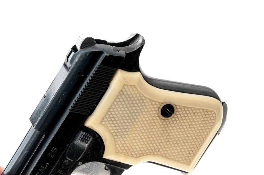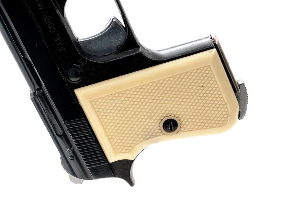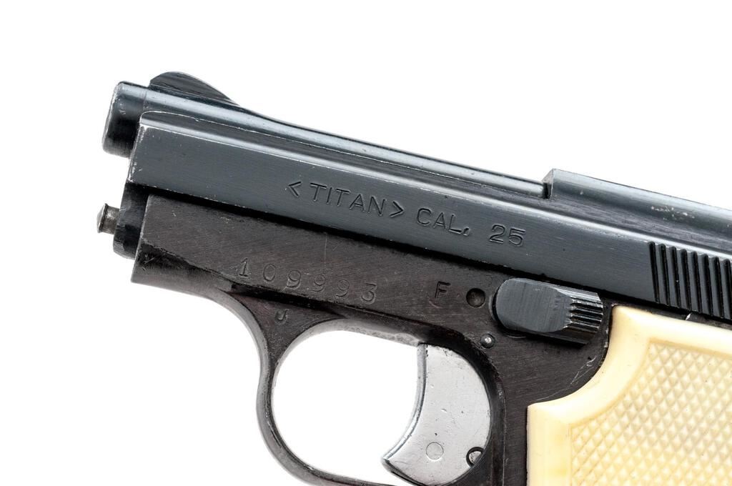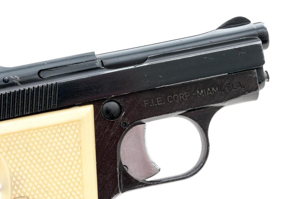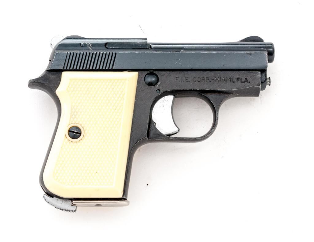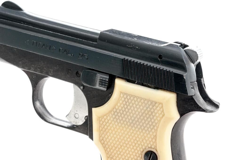 FIE Titan Semi-Automatic Pistol, #109993, .25 ACP cal., 2-3/8" barrel, blade front and fixed rear sights, black finish, checkered plastic faux ivory two-piece grips, with one magazine. Right side of frame is marked "F.I.E. CORP. ? MIAMI, FLA." Pistol is in good overall condition retaining approx. 85% flaking black finish, with edgewear and intermittent light scratches. Action functions well, bore is good. Est.: $100-$200. (Modern/PPT)