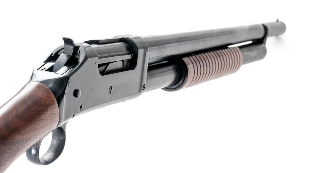 IAC Model 1893/97 Slide-Action Shotgun, #0602265. 12 ga. 20" plain barrel has a 2-3/4" chamber and is choked Mod. Action is made to look like a Winchester Model 1893 but has all the 1897 improvements. Receiver and barrel are deep blue and unengraved. Tubular forend and Prince of Wales buttstock are walnut, with a black buttplate. Mfg'd 2006 by SD Rizhou in China. Condition is like new showing little use, mostly by cowboy action shooters. Action cycles well and closes tight; bore is mirror bright. Est.: $400-$500. (Modern)
