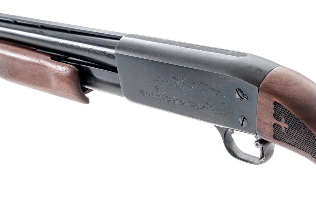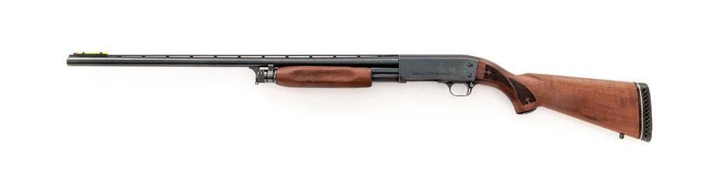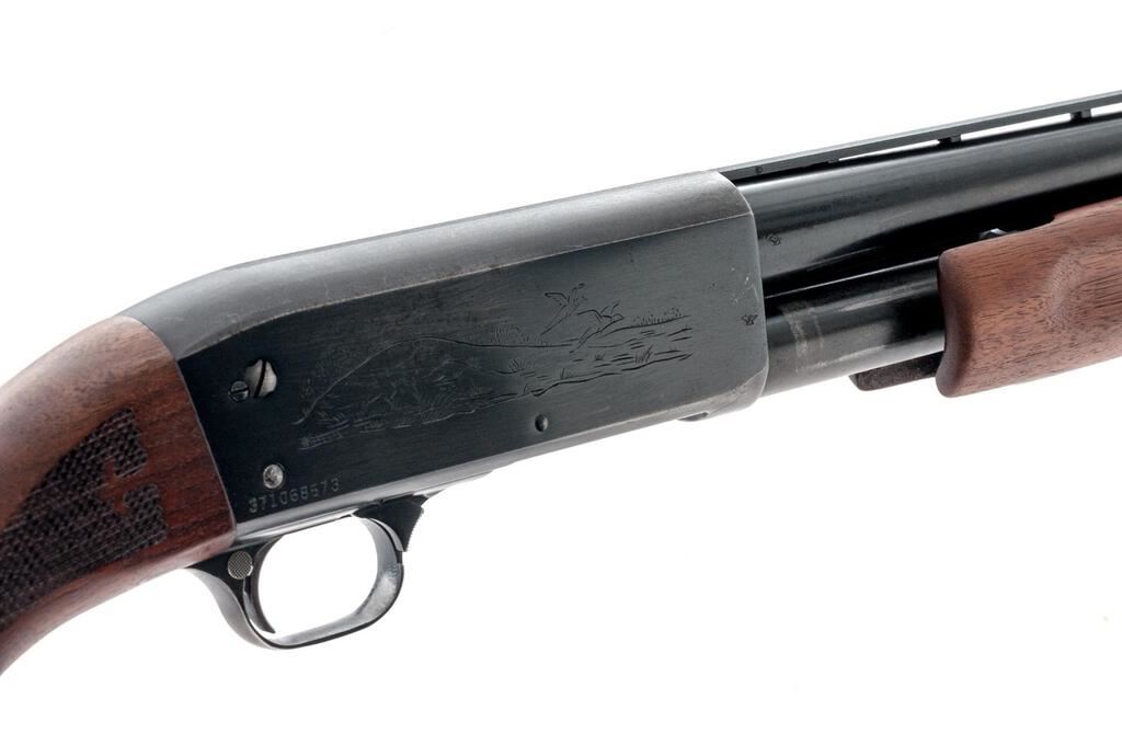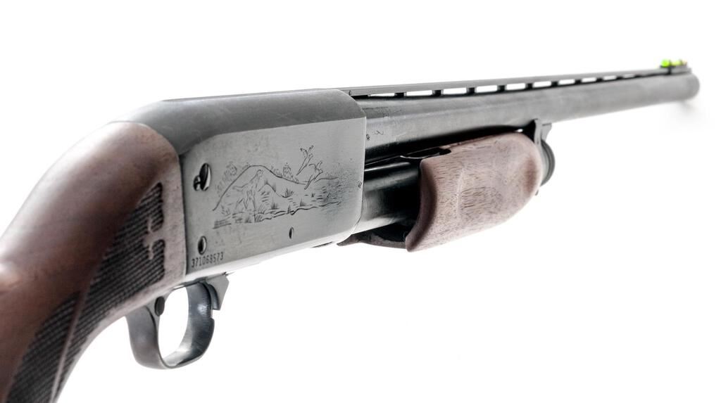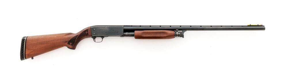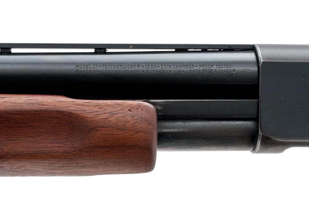 Ithaca Featherlight Model 37 Slide-Action Shotgun, #371068573. 12 ga. 28" vent rib barrel has a 2-3/4" chamber, Hi-Viz front sight, and is choked Full. The Model 37 action features bottom loading and ejection, with no sear interrupter; receiver lightly engraved. Uncheckered forend and press checkered pistol grip buttstock are satin-finished hardwood, with Ithaca grip cap and Pachmayr recoil pad. Mfg'd approx. 1970s. Condition is very good, with moderate wear to action, which slides smoothly, locks tight and functions correctly. Few small splits at pistol grip; bore is bright. Est.: $350-$450. (C&R)