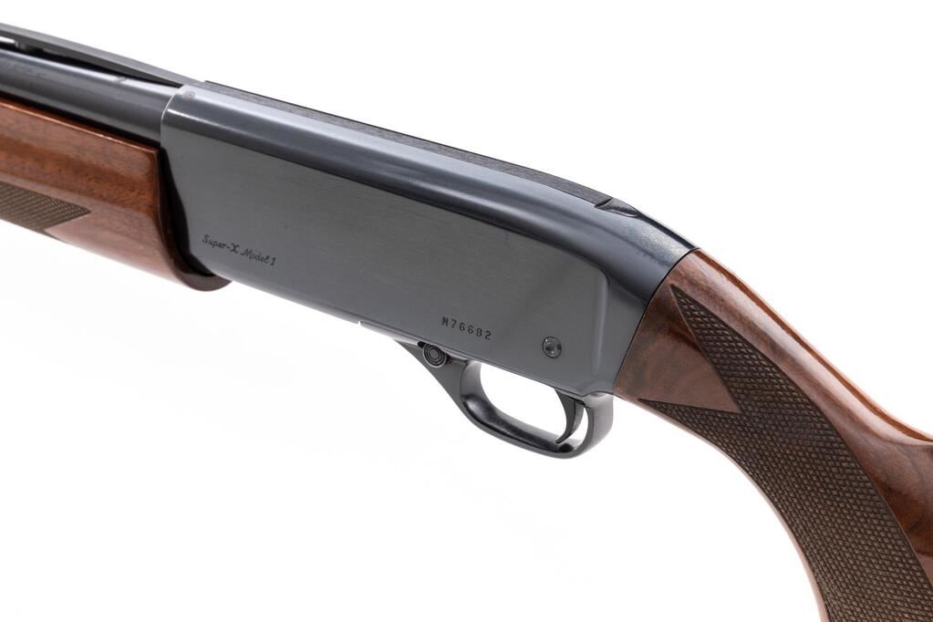 Winchester Super-X Model 1 Standard Grade Semi-Automatic Shotgun, #M76682. 12 ga. 30" vent rib barrel has target sights, 2-3/4" chamber, and is choked Full. The gas-operated Super-X action operates well and includes machine-turned bolt and shell lifter. The full finger-groove forend and pistol grip buttstock are of nice grain walnut, with thorough coverage of checkering, metal grip cap and buttplate. Includes extra butt pad and paperwork. Mfg'd mid-1970s. Condition is very good to near excellent, with few handling marks to wood and little wear to metal except where shell catcher was mounted. Action snaps closed tight, shows little wear, and functions correctly; bore is bright. Es.: $350-$500. (C&R)