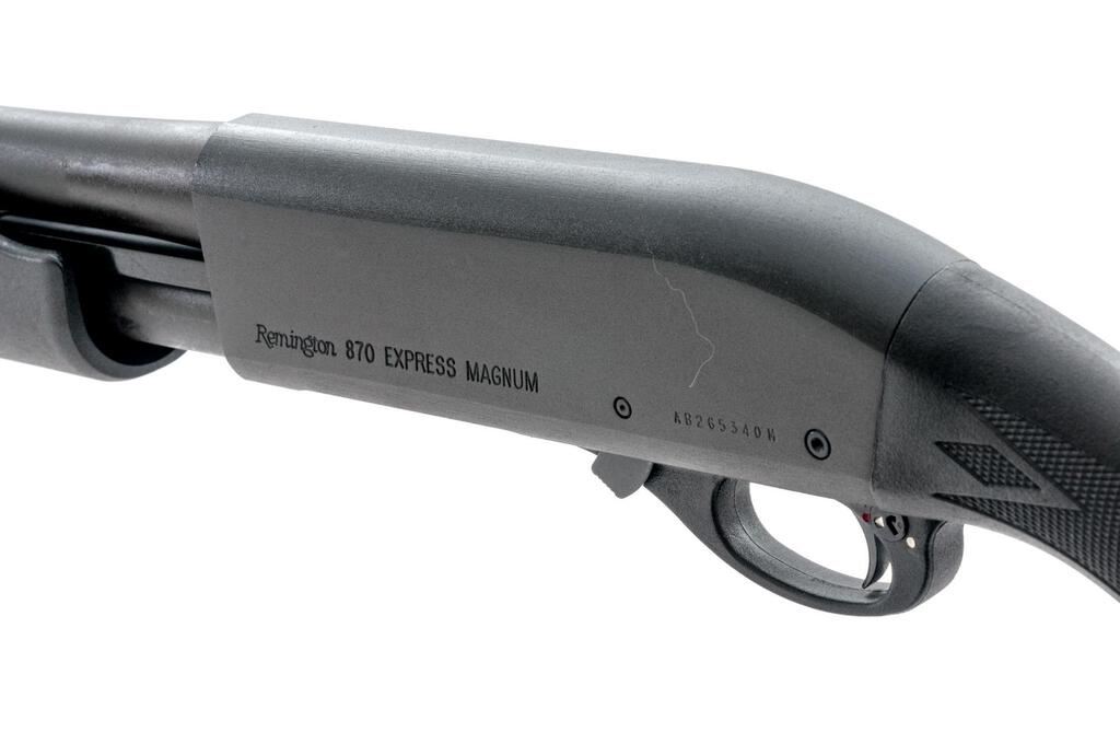 Remington 870 Express Magnum Pump Action Shotgun, #AB265340M, 12 ga., 20'' barrel choked Cyl. bore, 2-3/4" or 3" chamber, phosphate finish, synthetic stock, with factory black rubber butt pad. Extended magazine tube brings total capacity to seven (7) rounds. Overall condition is excellent showing little use, bore is mirror bright. Est.: $350-$500. (Modern)