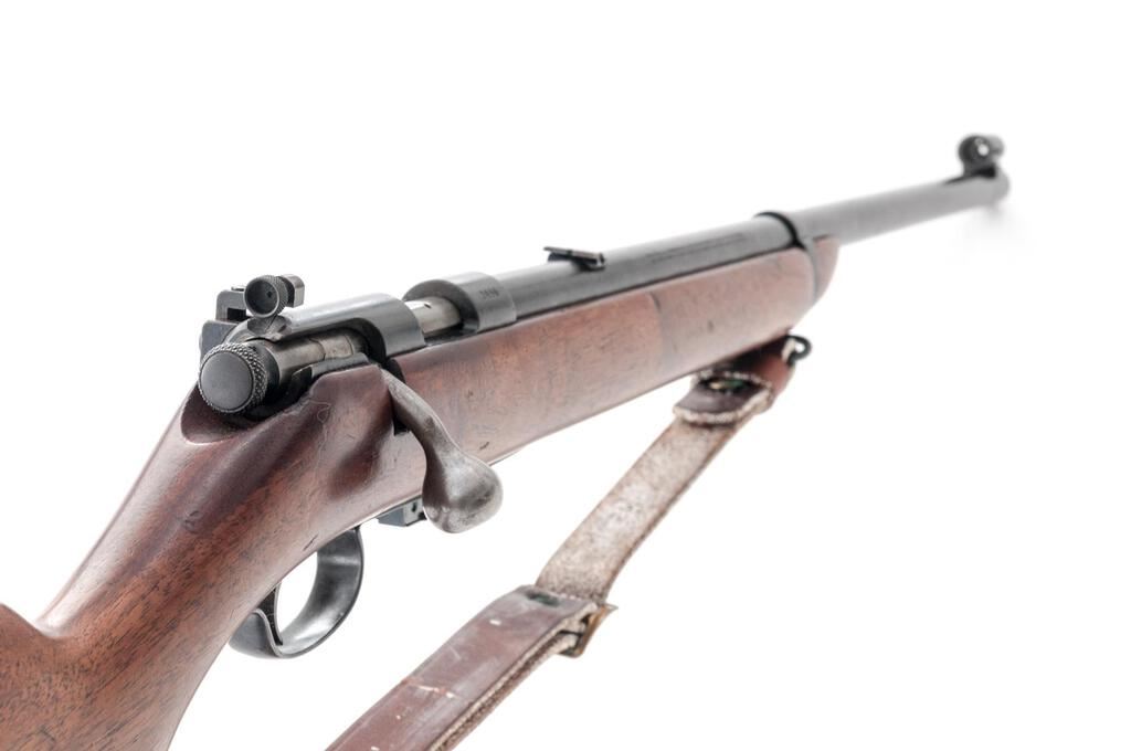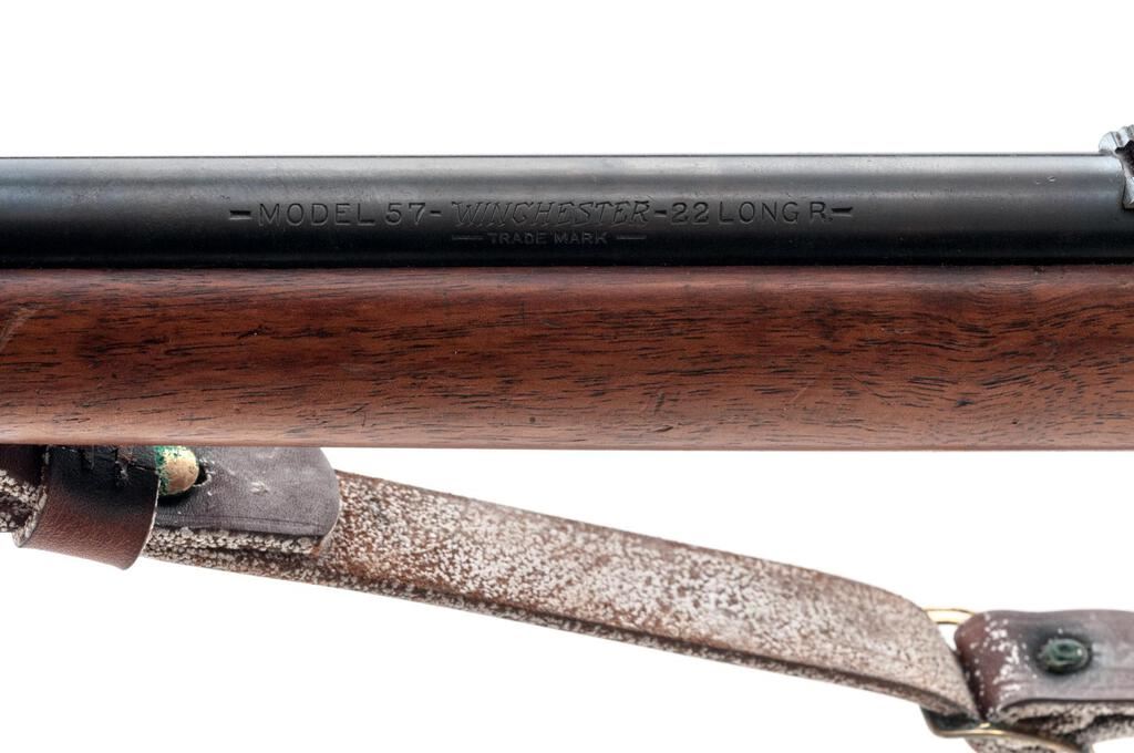 Winchester Model 57 Target Bolt Action Rifle, #2496, .22 LR cal., 22" barrel, Lyman globe style front and folding leaf rear sights, blue finish, smooth walnut one-piece pistol grip stock, magazine eject button on the stock, one Winchester marked 5-rd. magazine marked "MADE IN U.S.A./WINCHESTER/TRADEMARK" on the base, Lyman aperture sights at the rear of the receiver, sling swivels, and a period leather rifle sling. Mfg'd 1927. Rifle is in fine overall condition retaining approx. 90%-92% toning blue finish, with some wear at the muzzle, small scratches, and areas of light surface erosion, primarily along the barrel. There are crisp Winchester "WP" proofs on the barrel and front ring. Bolt is in the white, while the knurled cocking knob is blued. Smooth wood stock is in very good condition with small scrapes and mars from carry and use. Buttstock ends with a deteriorated solid rubber pad providing a 13-3/8" LOP, with 13" to the wood. Action is crisp and functions smoothly; bore is good showing use with defined rifling. Est.: $400-$600. (C&R)