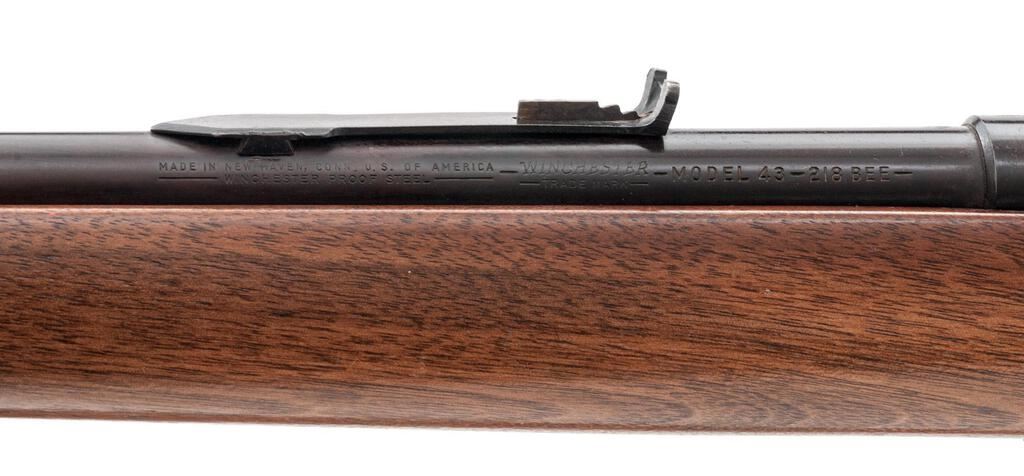 Winchester Model 43 Bolt Action Rifle, #22019A, .218 Bee cal., 24" tapered round barrel, hooded ramped blade front and semi-buckhorn rear sights, blue finish, smooth walnut one-piece pistol grip stock, one unmarked 5-rd. detachable box magazine, sling swivels, and a period leather military style rifle sling. Mfg'd 1950. Rifle is in very good overall condition with metal surfaces having drifted to an even plum patina, and original blue finish still evident in the protected areas, trigger guard and magazine well. Left wall of the receiver has four additional tap holes for a side mount, three are filled and one is vacant. Receiver also has been factory drilled and tapped for a receiver sight at the rear of the action with the holes filled. There are crisp Winchester "WP" proofs on the barrel and front ring and a matching serial number on the bolt. Trigger shows muted case colors. Stock is in very good condition ending with a checkered steel buttplate providing a 13-3/8" LOP. Bright bore is good with defined rifling, and the action works well on this early Model 43, desirable in the .218 Bee chambering. Est.: $700-$900. (C&R)