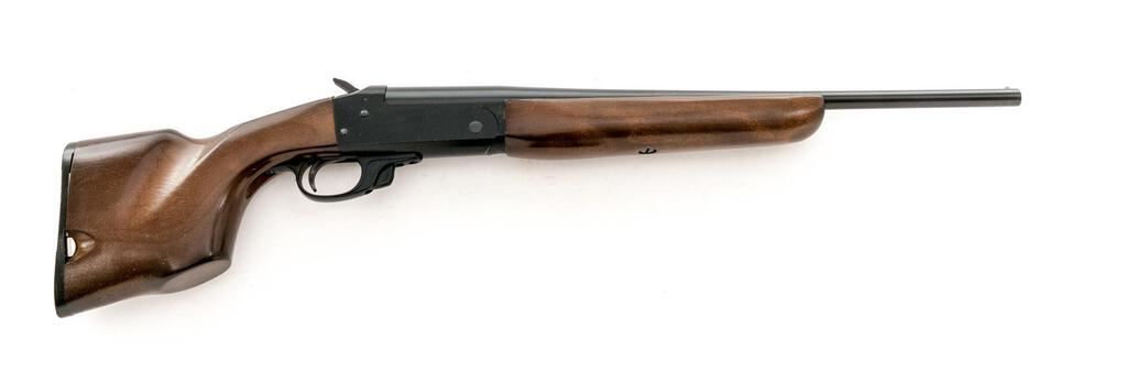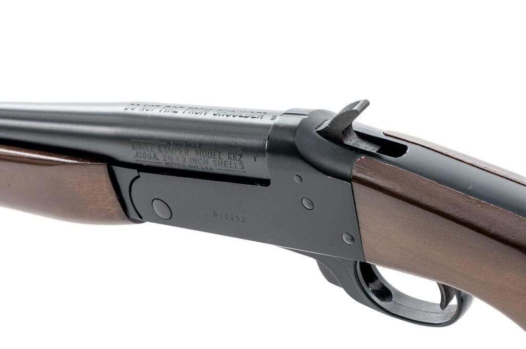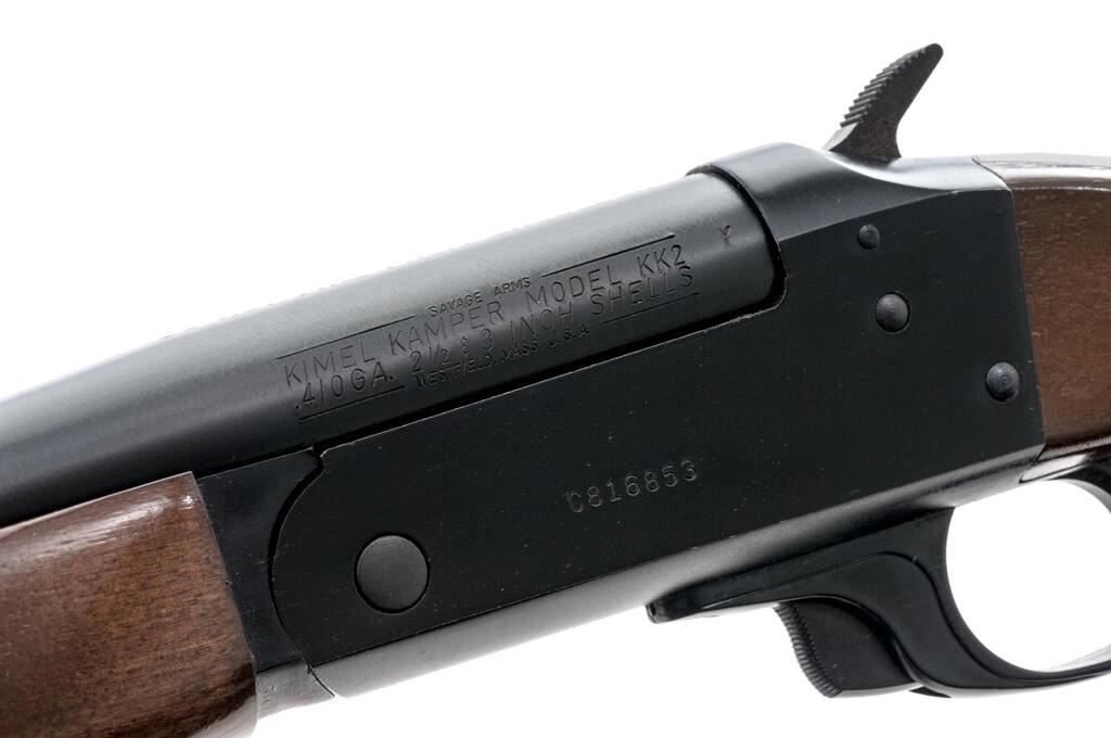 Savage Kimel Kamper Model KK2 Single Shot Shotgun, #C816853. .410 bore, 18.5" plain barrel has a 3" chamber and a Full choke. Boxlock action has a release in the trigger guard, half-cock safety, and auto ejector. Full forend and short pistol grip handle are stained hardwood, with storage for extra rounds in the butt. Mfg'd approx. 1980. Condition is near excellent, with slight marks to wood but little wear to metal or action, which closes tight and functions correctly. Bore is bright. Est.: $200-$250. (Modern)