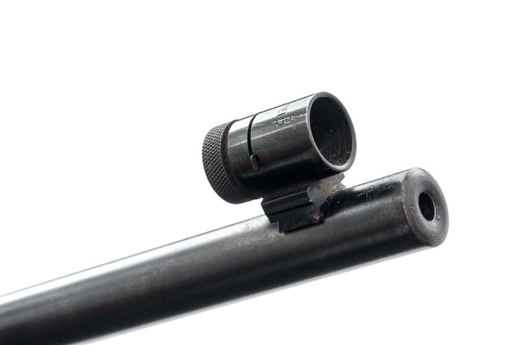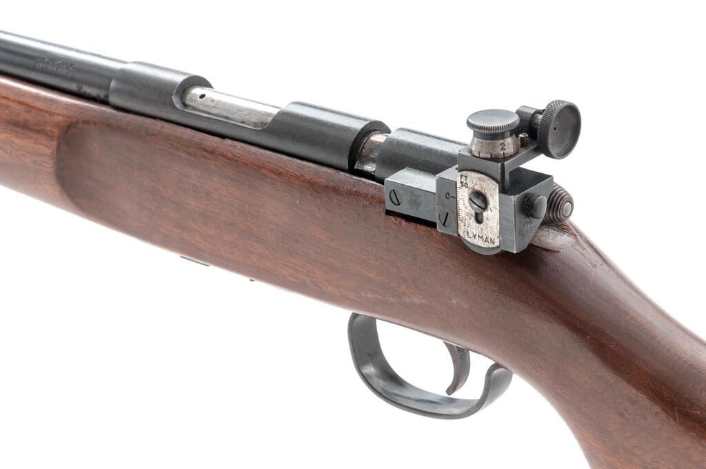 Remington Model 521-T Junior Special Bolt Action Rifle, NSNV, .22 S/L/LR cal., 25" round barrel, Redfield globe style front sight and no accommodation for a rear sight, Lyman aperture sight at the rear of the receiver, blue finish, smooth wood one-piece target stock with an accessory rail and sling swivels, and 6-rd. detachable Remington marked magazine. Mfg'd 1948. Rifle is in near fine overall condition retaining approx. 90%-92% toning blue finish, with light scratches and some discoloration at the front ring. There is scattered fine surface rust on the magazine well and trigger guard. Rear of the bolt, bolt handle and trigger show muted case colors. Smooth wood target stock is in good condition with a couple of 1.25" lateral cracks and a crude repair at the front of the forend. Buttstock ends with a black spacer and a replacement White Line solid rubber recoil pad providing a 12.25" LOP. Action works well, bore is bright with crisp rifling. Est.:  $300-$400. (C&R)