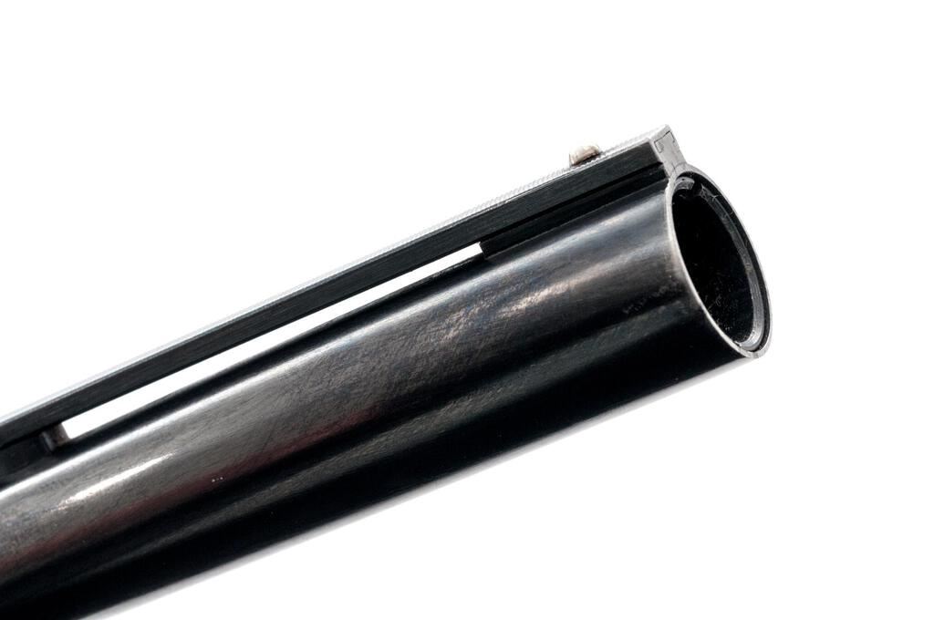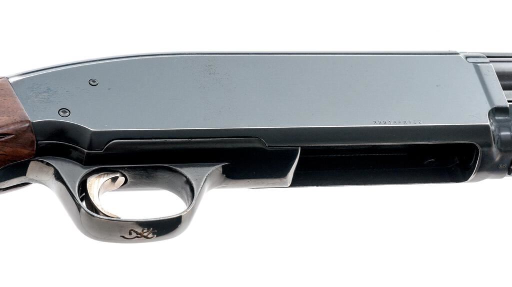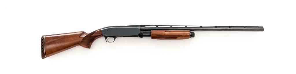 Browning BPS Field Model Slide-Action Shotgun, #33318PX152. 12 ga. 26" vent rib barrel has a 3" chamber and is fitted for standard Invector choke tubes (Full installed). The slide action is an update of the John Browning 1917 patents and is similar to the Ithaca M37, featuring downward ejection. The finger-groove forend and pistol grip buttstock are "B" Gade walnut, high gloss finished, with very sufficient checkering, no grip cap, and a Browning Pachmayr Whiteline recoil pad. Mfg'd 1983 by Miroku in Japan for Browning. Condition is very good retaining approx. 90%-95% finish, with little wear to the positive action, which locks up tight and functions correctly. There are a few small handling marks to the wood, some blue wear to the top of the receiver near the safety, and a small depression in the vent rib near the breech. However, the gun is sound, bore is bright, and should function well for years. Est.: $300-$400. (Modern)