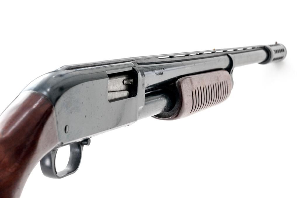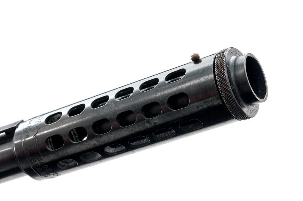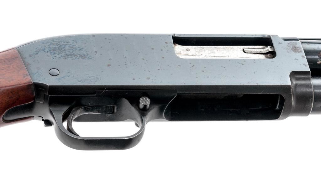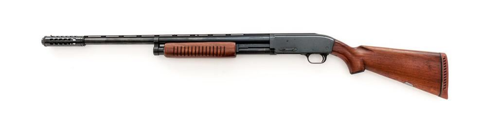 J.C. Higgins Model 20 Field Grade Slide-Action Shotgun, NVSN. 12 ga. 26.5" vent rib barrel has target beads, 2-3/4" chamber, and is fitted with a "Power Pac" recoil reduction device, with a "short range" tube installed. The action is identical to the High Standard Model 200, with magazine cutoff. The simple forend and pistol grip buttstock are Field Grade walnut, uncheckered, with a plastic grip cap and red butt pad. Mfg'd approx. 1970's. Condition is good to very good showing moderate field use. Wood has numerous very small marks. Action cycles smoothly and locks tight; bore is very good. Est.: $150-$300. (Modern)