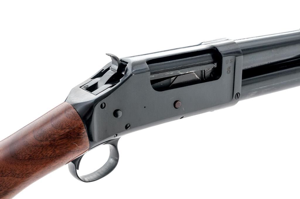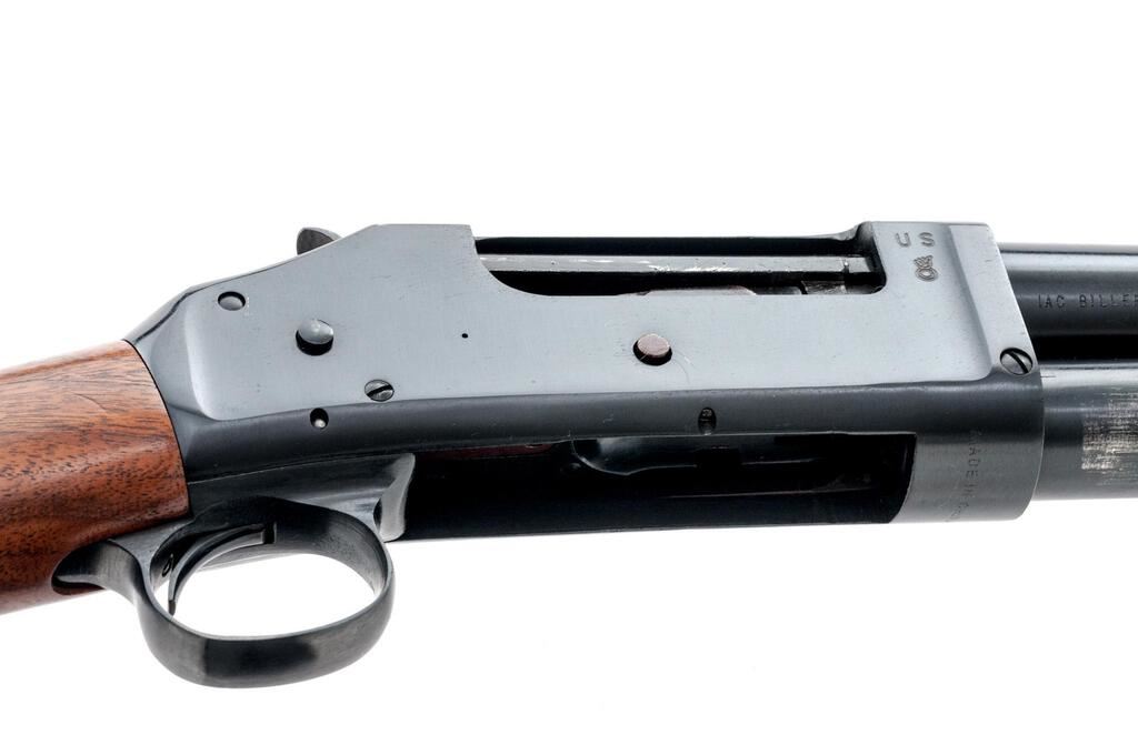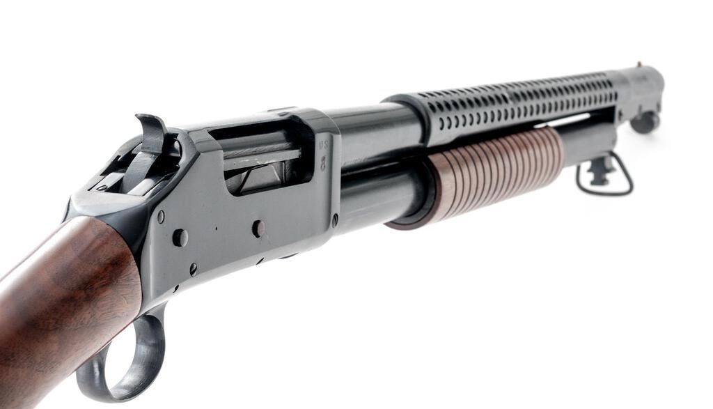 Norinco Model 97 Slide-Action Shotgun, #MJL2635, 12 ga., 20" barrel with heat shield, brass bead front and no rear sights, blue finish, smooth wood two-piece stocks, M1897 pattern bayonet lug, sling swivels and spur hammer. Shotgun is in near excellent overall condition showing little use, retaining approx. 96% factory blue finish with only light scratches and handling marks. Right side of the barrel is import marked and the underside of the receiver is marked "MADE IN CHINA". Stocks are in very good condition with a couple of faint scratches. Buttstock ends with a checkered plastic buttplate providing a 13-7/8" LOP. Bore is very good and the action is crisp on this Chinese copy of a Winchester M1897 trench gun. $600-$800. (Modern)