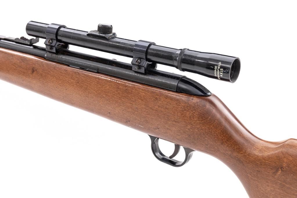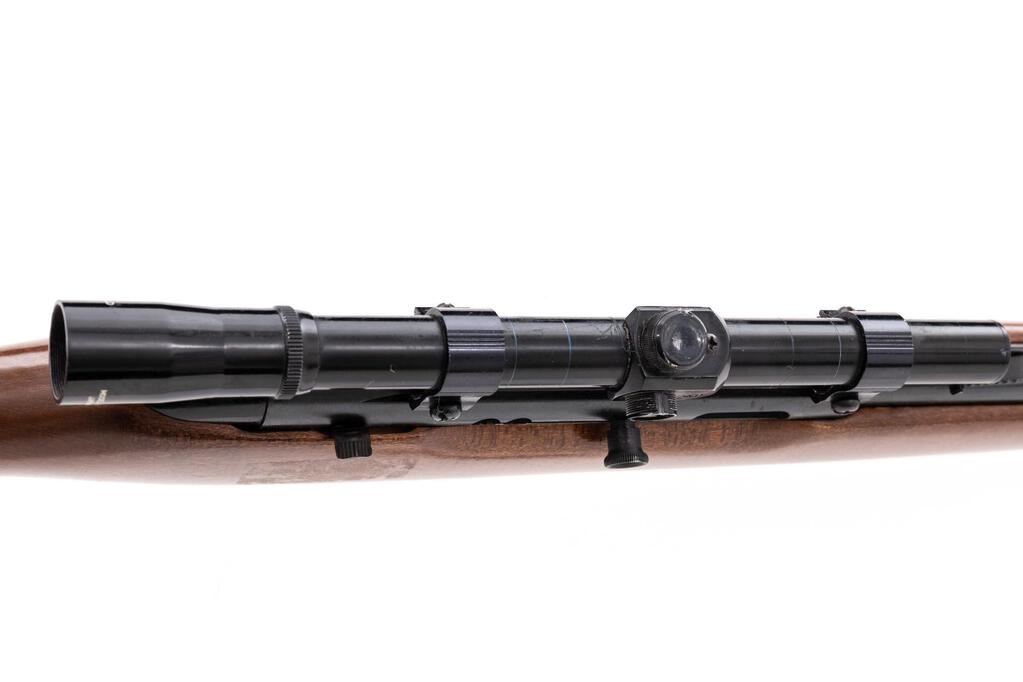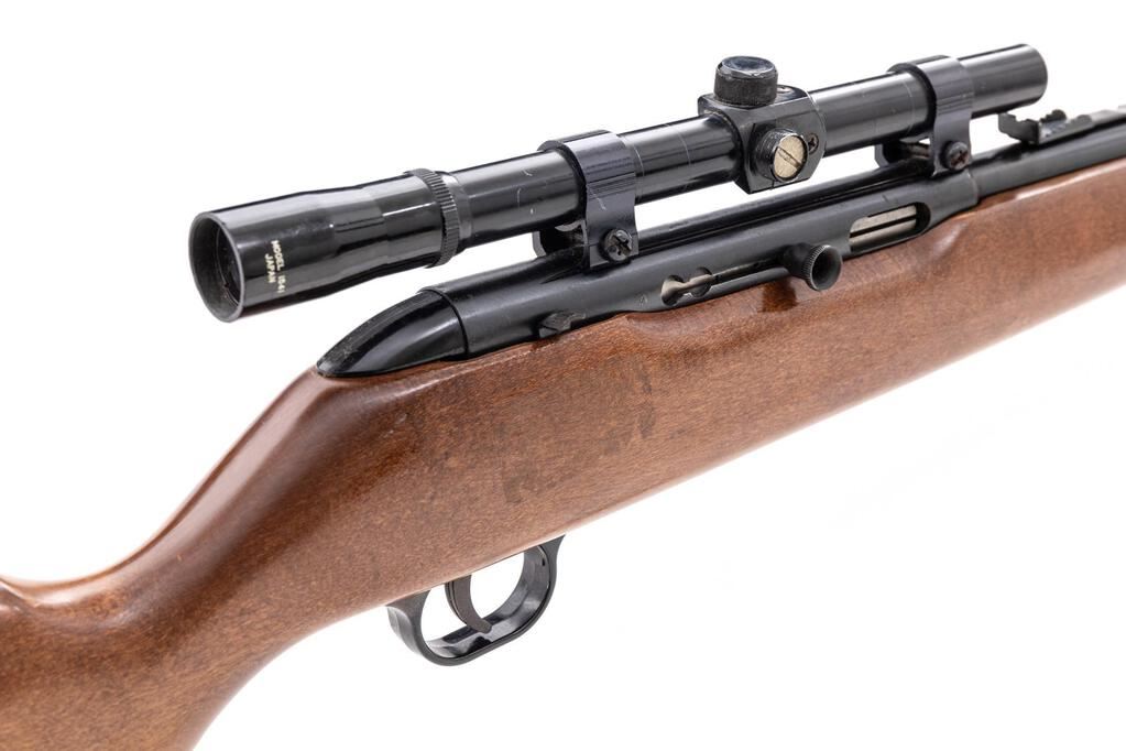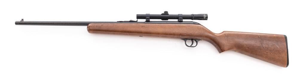 Mossberg Model 380 Semi-Automatic Rifle, #M39235, .22 LR cal., 20" barrel, blade front and standard elevator rear sights, blue finish, smooth wood one-piece pistol grip stock, ribbed plastic buttplate, tubular magazine that loads thru the buttstock, and plastic trigger guard. Factory grooved receiver is topped with rings and a Savage Springfield Model 1541 4x15 fixed-power scope in gloss black with fine wire reticle. Exterior of scope is worn with scratches and mars; glass is clear and bright. Rifle is in good overall condition retaining a significant amount of blue finish, with scattered light to moderate surface rust the length of the barrel due to poor storage. Smooth wood stock is good with dents, mars, and some paint transfer. Action functions well, bore is good. Would benefit from some TLC. Est.: $150-$250. (C&R)