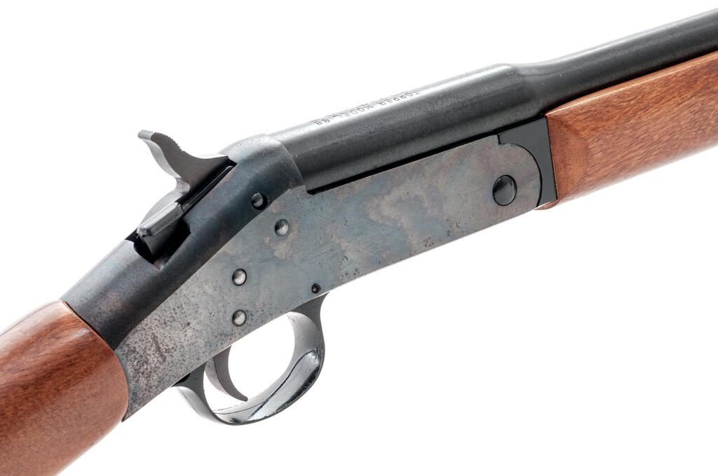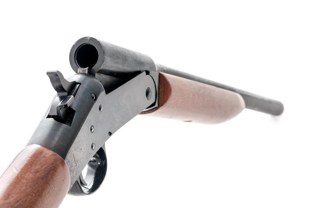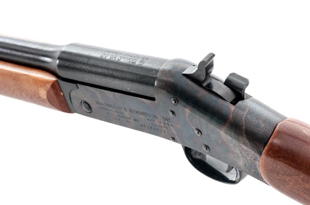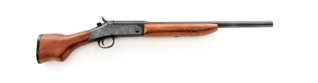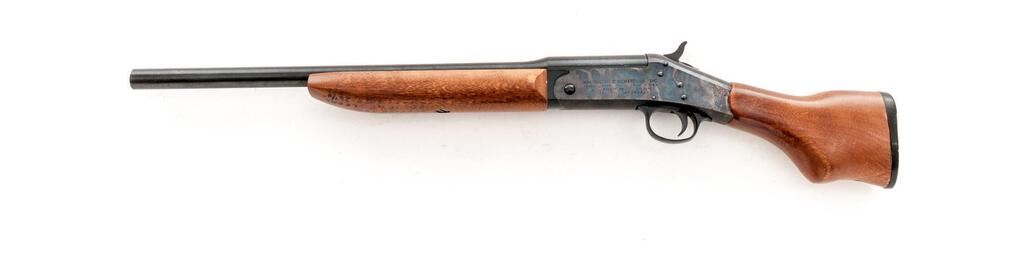 H&R Topper Model 88 Modified for Personal Defense Gun, #AT268523. 20 ga. 18-1/8" plain barrel has a 3" chamber and Cyl. choke. Action is standard Model 88, with push-button release and auto ejector. Pistol grip buttstock has been shortened to provide an overall length of 26.25", making it compliant to Calif. law. Mfg'd approx. 1980. Condition is like new, with approx. 95% blue and case hardening and little wear to action. Bore is bright. Est.: $200-$400. (Modern)