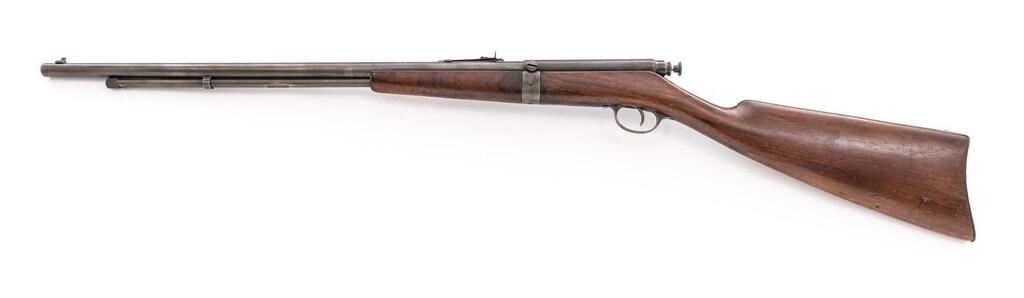 Hopkins & Allen No. 4922 Bolt Action Rifle, #6132, .22 cal., 22" barrel with 3/4 length tubular magazine, blade front and standard elevator rear sights, blue finish, smooth wood one-piece straight grip stock, with a smooth steel buttplate. Rifle is in good overall condition with the metal surfaces having gone to an even gray patina, showing mars and light surface erosion. Stock is good with dents, compressions, and a crude 3" repair on the underside just ahead of the trigger guard. Action works smoothly, bore is fair and may clean to good. Est.: $100-$200. (C&R)