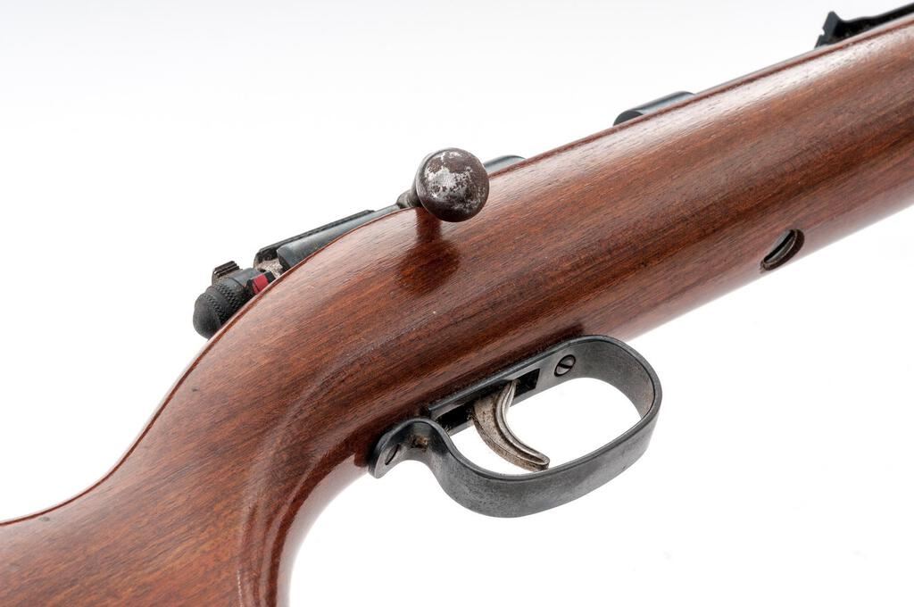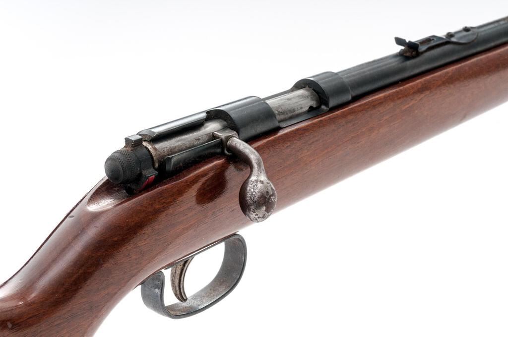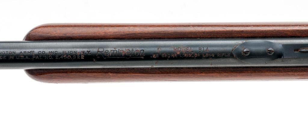 Remington Model 514 Single-Shot Bolt Action Rifle, NVSN, .22 S/L/LR RF cal., 25" round barrel, dovetailed beaded blade front and adjustable leaf rear sights, marked with maker's name, address, pat. no., logo, model and caliber on top; receiver with polished turn-down bolt, rear safety-knob; oil-finished walnut halfstock has loop trigger guard, checkered hard rubber buttplate with circular Remington logo. Mfg'd with full-blued finish. Condition is very good retaining approx. 70% blue with scattered rust erosion and bright bolt. Sound stock with scattered use marks, approx. 1.5"x5.5" sanded area at left-side receiver, and very good finish. Action is crisp, bore is bright with fine rifling. Est.: $150-$300. (C&R)
