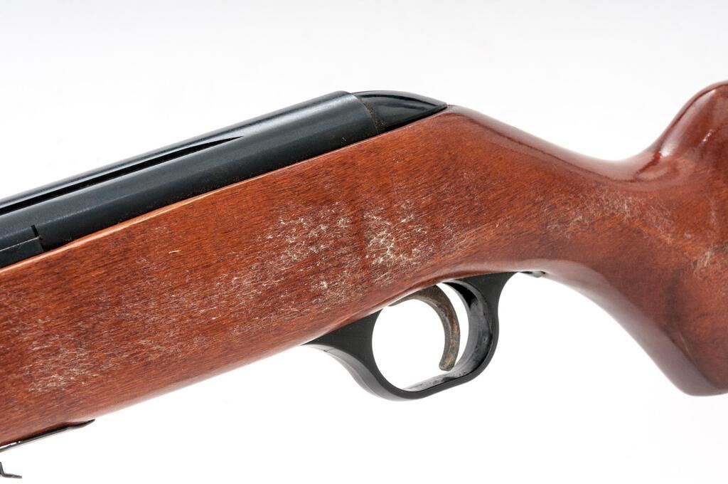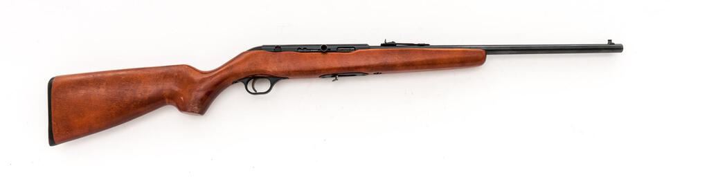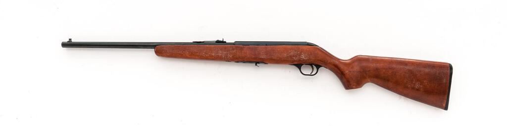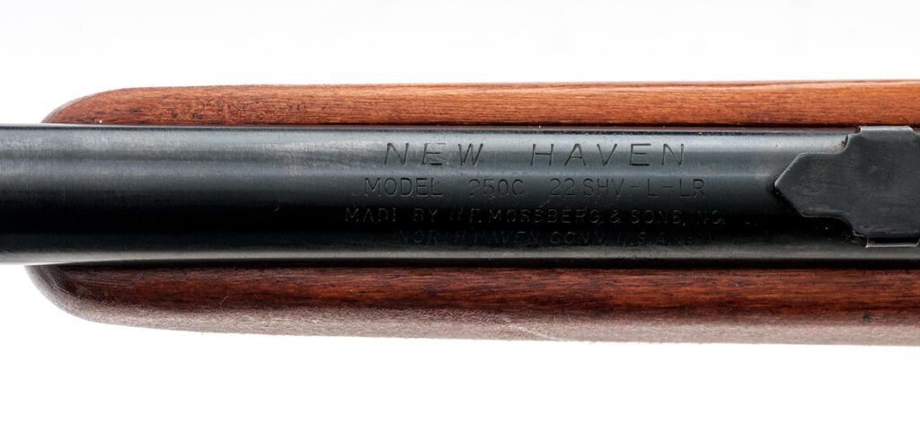 Mossberg New Haven Model 250C Semi-Automatic Rifle, NVSN, .22 SHV-LR cal., 18.25" barrel, blue finish, one-piece pistol-grip hardwood stock with black plastic buttplate; blade front sight and square-notched rear sight with elevator.  Receiver is factory grooved for scope rings.  No magazine.  Condition is good retaining most of its original metal finish.  There are a few tiny specks of surface rust on the barrel.  Stock needs to be cleaned or refinished; doesn't show much handling wear, but the finish is tacky and now has unknown fibers adhered to the finish on the left side.  Action is smooth, bore is bright with excellent rifling.  Est.:  $80-$120. (C&R)