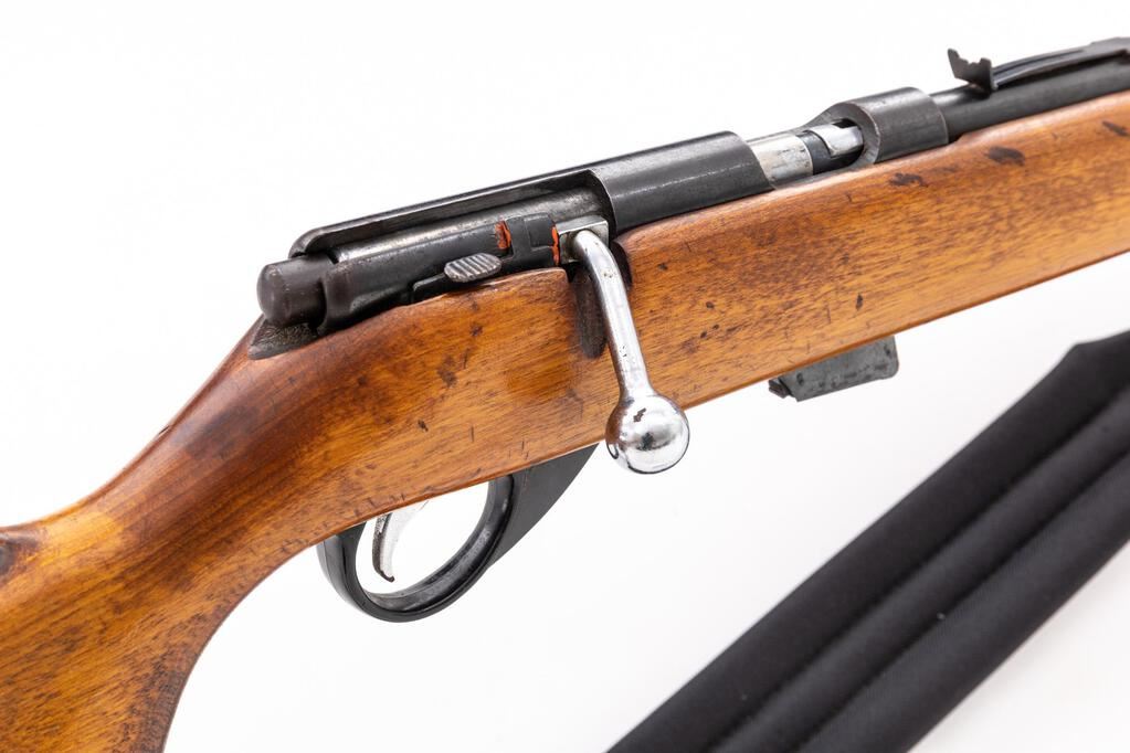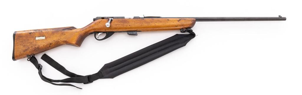 J.C. Higgins Model 103.16 Bolt Action Rifle, NSNV, .22 S/L/LR cal., 24" barrel, dovetailed brass bead blade front and standard rear sights, chrome bolt, blue finish, smooth wood one-piece pistol grip stock with sling swivels, padded nylon rifle sling, ribbed plastic buttplate, and one 7-rd. detachable box magazine. Rifle is in good overall condition retaining a considerable amount of toning blue finish drifting to plum patina, scattered light surface rust and erosion, and a plastic trigger guard. There are four holes on the left side of the action for a side mount; all are filled with tap screws. Smooth wood stock is in good condition with mars, dents and wear. There is a vacant 1.5" rectangle on the left side of the buttstock where an inlay has been removed. Action functions well, bore is good. Est.: $100-$200. (C&R)