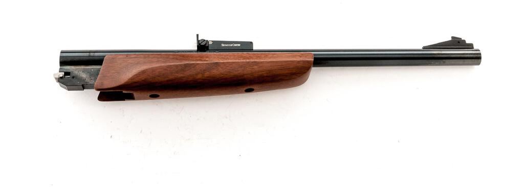 Thompson Center Contender Factory Barrel, .22 Rem Jet Mag. cal., 16.25" blued barrel, standard ramp front sight with adjustable rear sight, hardwood forend. Condition is near excellent with blued finish, showing only minor handling marks and a small area of pitting on the right rear just above the lug. Factory lettering is clear and crisp. There is a possible serial number "704960" electro-penciled on the left side of the lug, and "40 7/16/08" on the right. Forend is near excellent with only minor handing marks. Bore is bright. Est.: $200-$350.
