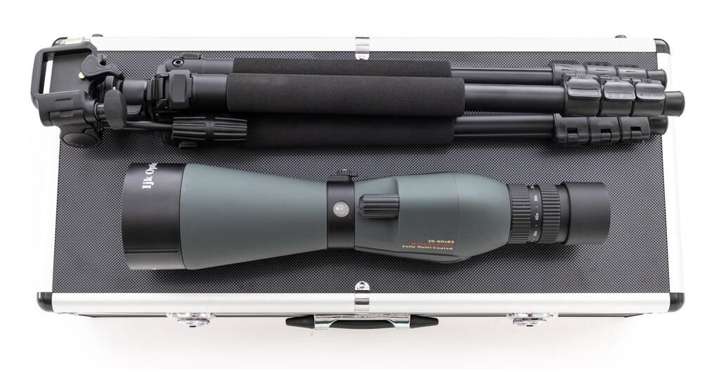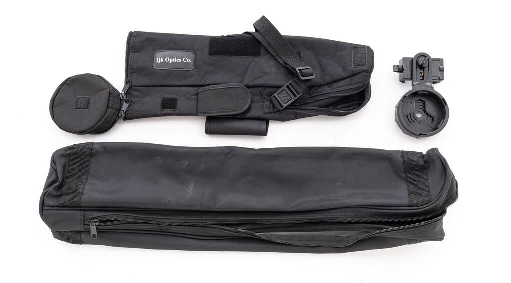 IJK Optics Company 20-60x85 Waterproof Spotting Scope, with straight eyepiece and rubber coating. Includes tripod, Snakelook spotter for your smartphone, lens caps, hardcase, tripod, and black nylon cases for both the scope and tripod. Scope is in excellent condition showing little use, optics are clear. Est.: $250-$450.