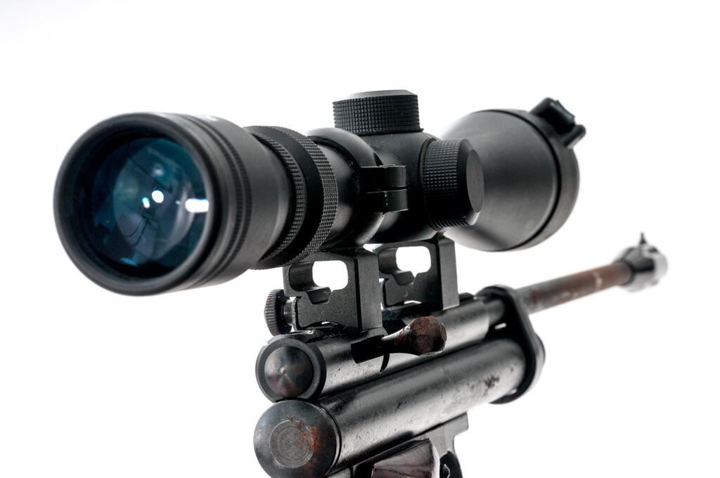 Crossman Model 2300 CO2 Powered Air Pistol, #SPW642696, .22 cal., 16" barrel including muzzle device, blued finish, smooth wood grips, topped with an AIM 3-9x40 scope. Pistol is in overall good condition. Metal surfaces have scattered rust and pitting on the air tube and cocking piece, and a majority on the barrel. Wood grips exhibit minor scuffs and handling marks. Pistol has not been tested for function, and there is an empty CO2 container in the tube, which we are not able to remove. The AIM scope is in very good condition, medium crosshair reticle is clear; front objective is covered by an unmarked scope cap with a broken hinge. Est.: $80-$120.
