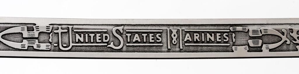 Lot of Two (2) Reproduction Swords: (1) Modern reproduction of the U.S. Marine Corps enlisted man's dress sword. Etched decorated bright steel blade with "United States Marine Corps" embossed. Blade has been sharpened. Silver/gold colored plated guard and pommel with pierced floral designs. Leather covered grooved handle with twisted wire wrapping. Leather covered metal scabbard with silver/gold colored plated fittings at top and bottom. White leather frog does not have a hole for the frog stud, and has a small piece cut from the back side. Blade measures 29.75", OAL is 39". Condition is as new with little to no wear and light oxidation to the plated metal surfaces. Leather on the grip is loose near the top edge. White leather frog shows light soiling and cracking to the finish. (2) Repro Confederate Musician's Sword, with leather scabbard. Crude cast grooved grip and clamshell guard with C.S.A. embossed. Thin bow knuckle guard attaches to rounded pommel with round top nut. Wire knot hanger at top nut. The 36" blade is plain with a wide groove near the top spine. Scabbard is leather with brass fittings at top and bottom, the top fitting having a long frog stud. OAL is 43". Condition is good, the brass handle fittings have a darkened forced patina. Grip has some flattened ridges and is very crude. Blade has a grayed forced patina overall and is not sharp. Leather on the scabbard shows cracking, scuffs, and scratches to the black-painted finish. Brass fittings on the scabbard have a darkened forced patina with a few light dings and scratches. Est.: $150-$200/Lot.