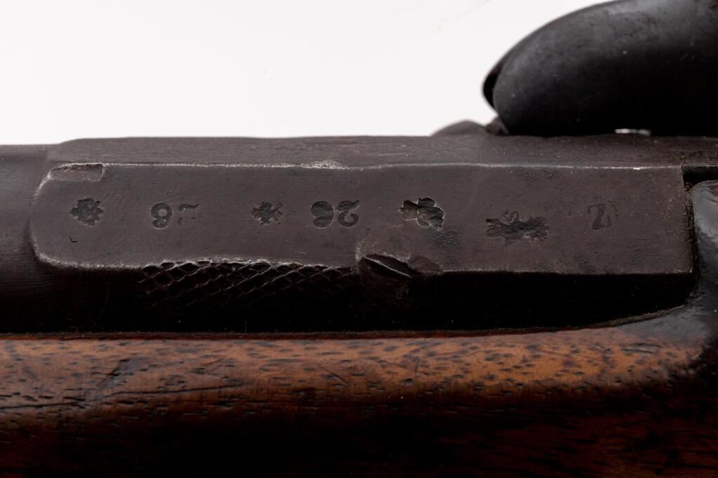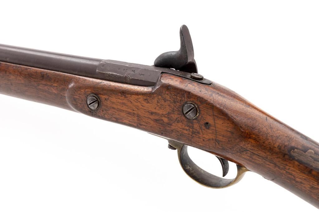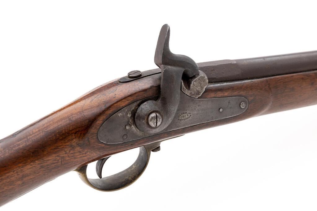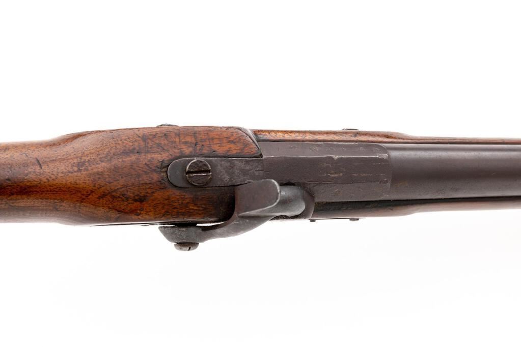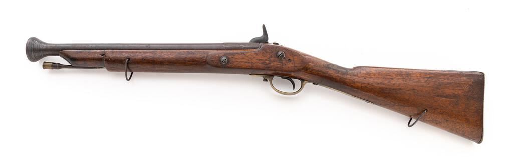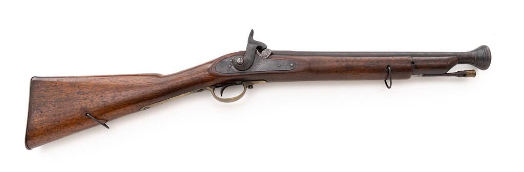 Antique British Percussion Short Blunderbuss, NVSN, approx. .52 cal., 15.75" 2-stage barrel bells to 1.75" at ring-turned muzzle, marked "26" (3 times) with 4 Birmingham proof marks at left breech flat; flat lockplate is marked "Glukman/1862/Birmingham" in oval below bolster, "(crown)/JC" at front; brass trigger guard and buttplate are marked "D", iron ramrod with brass barrel tip. Oil-finished walnut fullstock has sling loops fore/aft. Condition is very good, the dark barrel being smooth with scattered light erosion, good edges and clear markings, brass with moderate patina. Stock is sound and smooth with a 1.5" scrape and secure 2" V-crack at left wrist, else light use marks, appears to have had a band 5.25" behind muzzle (now missing) and re-shaped at nose (possibly due to damage). Action is very strong, nipple is mashed, smoothbore shows overall moderate erosion. Est.: $1,000-$1,500. (Antique)