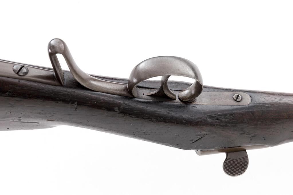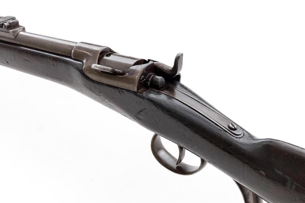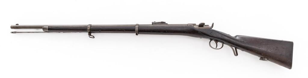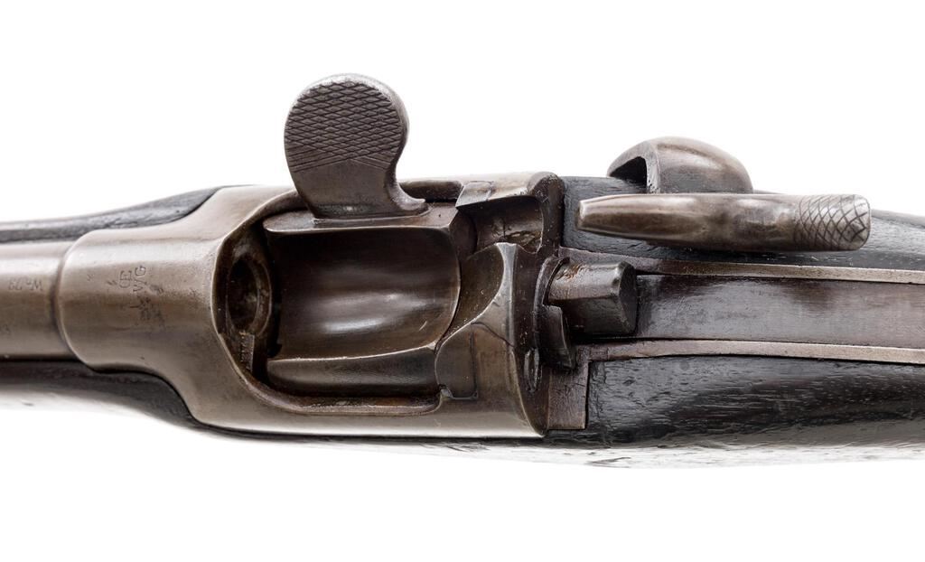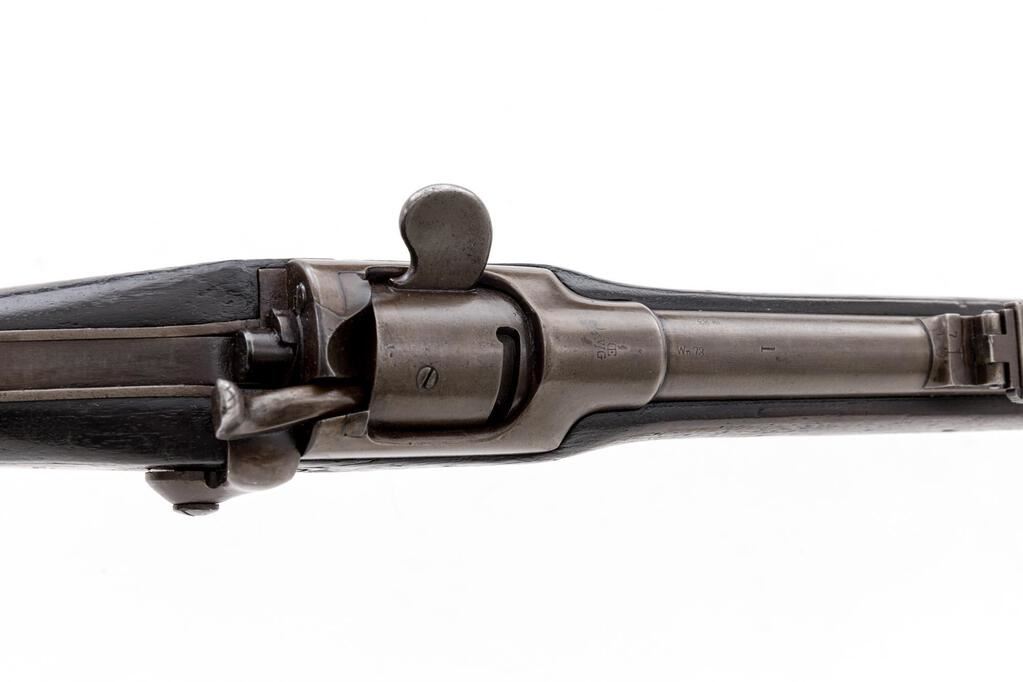 Austrian Model 1867 Werndl Breechloading Single-Shot Military Musket, #872, 11mm CF cal., 33.25" round barrel has block-blade front sight and large graduated folding-leaf rear, bayonet lug 4" below right muzzle, marked "1", "St 83" and "Wn 73"; receiver marked at top with conjoined "OE" and "WG", has unique rotating breechblock with rebounding firing pin, 4" spring on tang to hold in place; long back-action lock has tiny sunken round "(lion's face)" mark over "872", hammer marked "B" and "3" at left side; steel fittings include trigger guard with long finger-rest, buttplate marked "V.L St. WB./5212", 2 clamping bands (top with sling swivel), nosecap, slotted ramrod. Oil-stained walnut 3/4 stock stamped "W" atop comb, has smaller marks and sling swivel at belly. Condition is very good showing smooth gray-brown gunmetal (bit of roughness forming at top of buttplate) having sharp edges and markings. Dark finished stock shows scattered dings and nicks from military use yet is sound. Action is strong and crisp, bore shows overall light etching and deep/sharp rifling. Est.: $1,200-$1,800. (Antique)