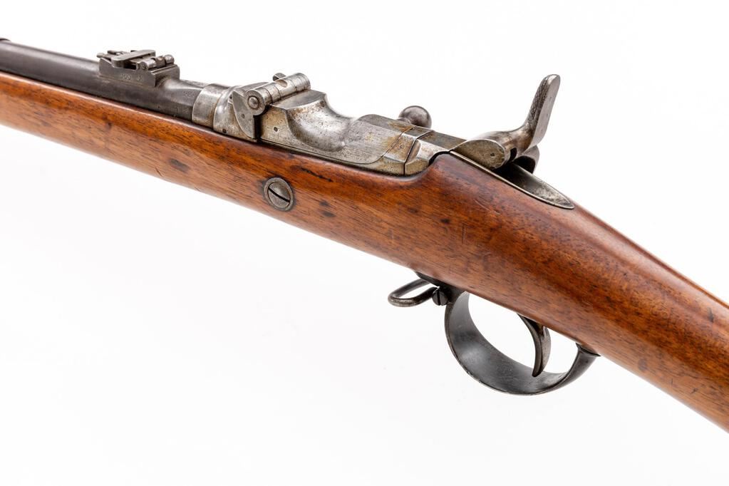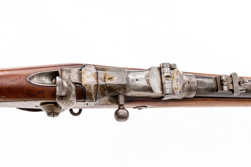 Antique Belgian M-1853/67 Albini-Braendlin Single-Shot Military Rifle, Dated 1868, #4890, 11x42mm CF cal., 26.75" round barrel with block-blade front (also bayonet lug) and folding-leaf rear sight (marked "300M"), has numerous marks at breech including "1868", "(crown)/AL", "38", encircled "N", and what may be a "(rampant lion)" within clipped rectangle; receiver has 3" front-hinged breechblock with knob at right, rebounding firing pin, auto-extraction and numerous marks including "38", sunken "P" outside, "K537" and others inside; 6" back-action lock marked with sunken "JP/53" has hammer with sliding striker (marked "4890"; steel fittings include trigger guard with sling swivel, buttplate marked "38", encircled "N" and "4890" at top, 2 spring-retained bands (upper with sling swivel and button), slotted cleaning rod. Oil-finished walnut 3/4 stock. Mfg'd as percussion rifle mid-1850s, altered to metallic cartridge breechloader ca. 1867. Condition is very good retaining approx. 80% thinning military blue and silvered case colors (hammer and buttplate with oxidation), sharp edges and markings. Stock is sound and smooth showing minimal marks, pleasing grain, color and finish. Est.: $1,000-$1,500. (Antique)
