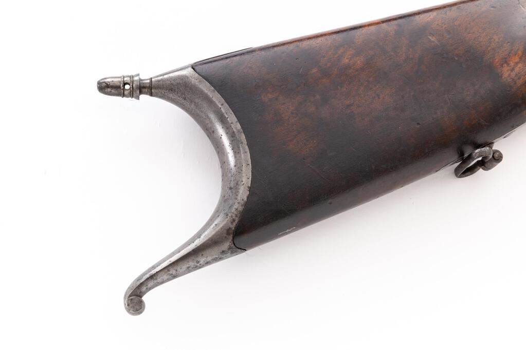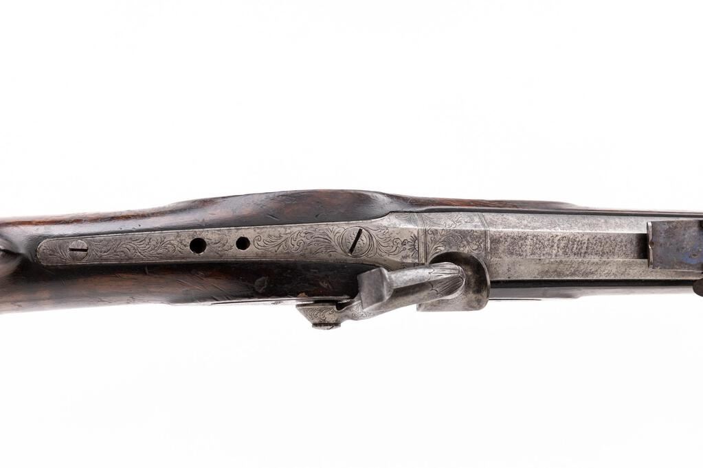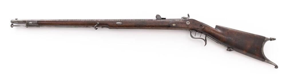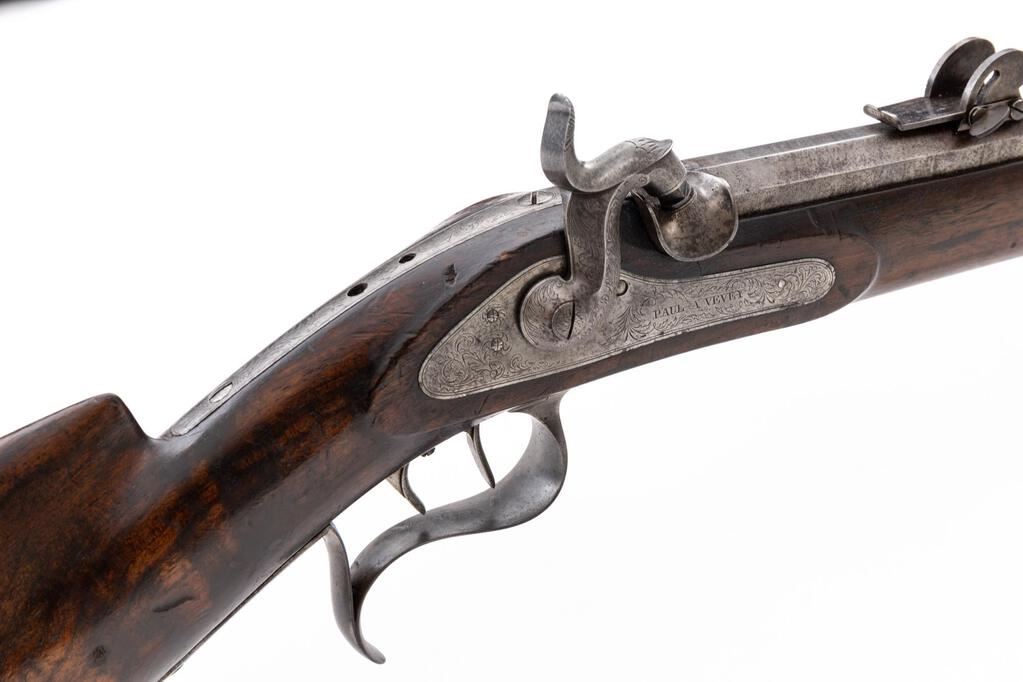 Swiss Model 1851 Feldstutzer Percussion Military Sharpshooter Rifle, NVSN, 11.5mm, key-retained 33" twist-pattern round barrel has dovetailed front blade and tall long-range rear sights, 3" tubular bayonet mount at right muzzle, circular bolster flash guard, "(crown)/B", "(crown)/O" and "(crown)/TR" proofs, fine floral engraving and what may be 2 silver bands at the 6" octagonal breech section (top tang with 2 threaded holes for missing peep sight); flat lockplate has matching engraving, "Paul A Vevey" under military hammer; steel fittings comprise heavy trigger guard with spur and rear sling swivel, Swiss buttplate having removable 4.5" threaded rod with acorn finial at top, 17" pipe/nosecap retaining the button-tip ramrod. Double set triggers. Fullstock of varnished walnut has deluxe grain, high comb, German-silver oval and shield (missing) inset at left apron, midpoint sling swivel. Condition is good, the barrel showing good twist pattern, traces of case colors to lock, else clean smooth metal with sharp edges, engraving and markings. Stock is sound showing age and use marks, 1" repair at bottom left, wear to much original finish. Action is crisp, triggers work as designed, bore shows etching in grooves, fine rifling. Est.: $1,000-$1,500. (Antique)