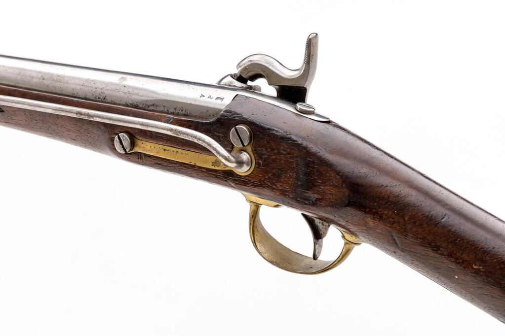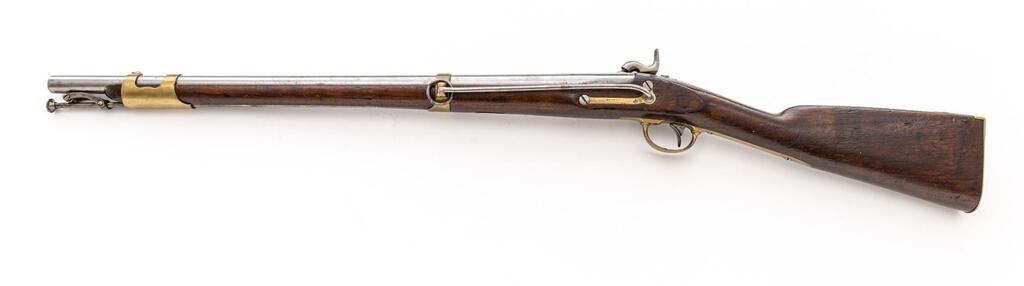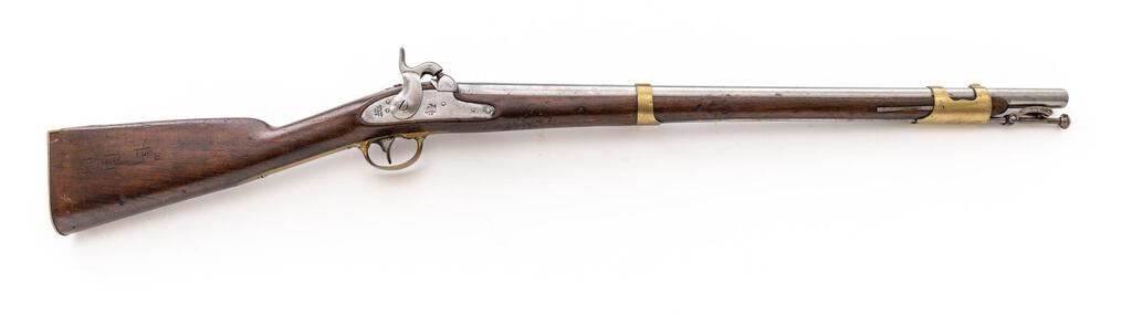 Mexican War-Era U.S. Springfield Model 1847 Percussion Cavalry Musketoon, NVSN, .69 cal., 26" round barrel without sights, marked "V/P/(eagle head)" and "1851" at breech; beveled lockplate has "(spread-wing eagle holding olive branches)" over "US" ahead of hammer, Spring/Field/1853" vertically behind; brass fittings are 2-pc. trigger guard, straight buttplate marked "U.S." at top, sideplate, 2 bands (front of the double-strap type with integral sight); steel 9.25" sling bar/ring at left, stirrup-retained button-tip ramrod. Oil-finished walnut fullstock. Mfg'd ca. 1848-59, in approx. 6000 qty. Condition is very good showing cleaned bright finishes, sharp edges and markings. Stock is sound with "J.P.F." carved at right, mild marks, added varnish. Action is strong and crisp, bore shows light to moderate etching and good rifling. Est.: $1,800-$2,400. (Antique)