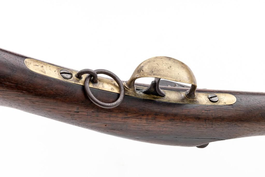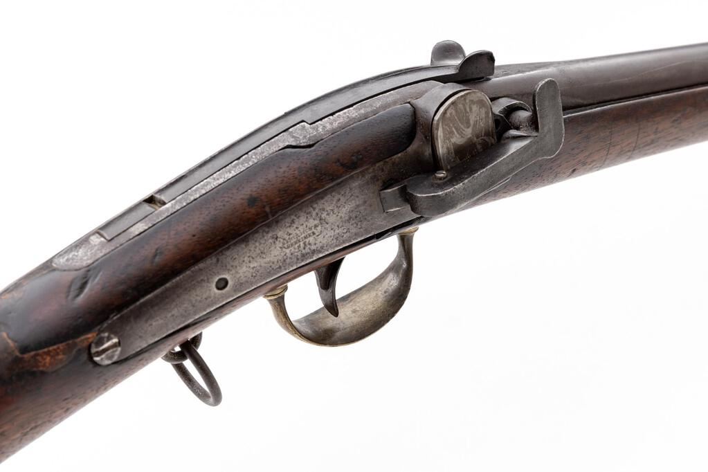 Very Rare Jenks "Mule Ear" Tape-Primer Percussion Carbine, NVSN, .54 cal., 24.25" round barrel is marked "W. Jenks/U.S.N./RP/P/1847/Cast Steel" at breech; long receiver has 5.75" rear-hinged breech-lever with articulated plunger to seat combustible cartridge in chamber, sighting groove between raised "wings"; 6.5" lockplate marked "Remington's/Herkimer, N.Y." has 2.25" mule-ear hammer, bottom-hinged Maynard tape primer door; brass fittings include trigger guard with rear sling-ring, buttplate, 2 screw-retained bands (upper with integral blade sight). Fullstock of oil-finished walnut. Mfg'd 1847-48, in just 1,000 qty. est. Condition is good, the barrel wears a lightly-oxidized brown patina, darkened case colors (pattern to primer door), age-toned brass, fine edges and markings. Stock is sound and smooth with "J.M" lightly scratched at right, repaired break between lockplate/top of receiver, 2" sliver out below lock, 3.5" crack at left, else nice grain, color and finish. Action is crisp, bore shows heavy erosion, fair rifling. Est.: $1,500-$2,000. (Antique)