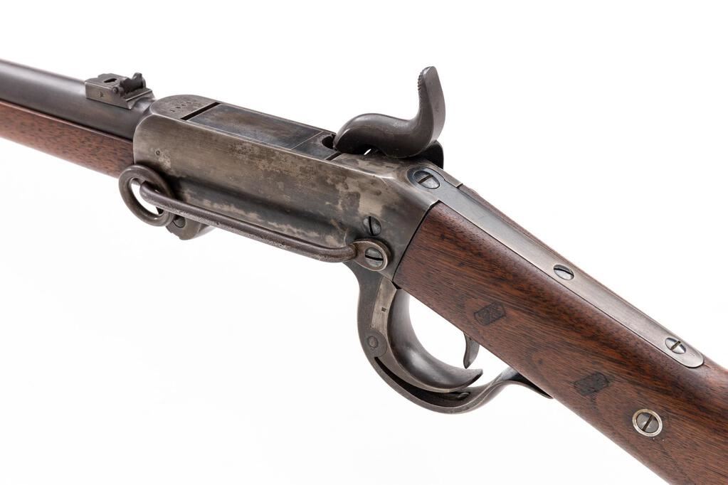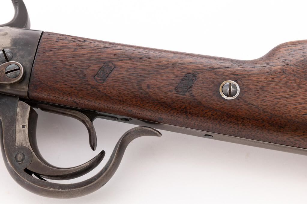 Civil War Burnside Breechloading Percussion Carbine, 5th Type, #10468, .54 cal., 21" round barrel marked "Cast Steel 1864" and "H", with standard carbine sights; receiver with curved trigger guard/operating lever, marked "Burnside's Patent/Model 1864/10468" at front and several inspectors' marks, has sling ring/bar at left; back-action lock and military hammer are both marked "H". Oil-stained walnut forend has single band, matching buttstock with 2 "G.C." cartouches of Inspector George Curtis at left wrist has semi-crescent buttplate (marked "C"), swivel at belly. Mfg'd 1864. Condition is fine retaining good traces of blue, mostly silvered case colors, else smooth gray/brown gunmetal with sharp edges and markings. Stocks are sound and smooth (.75" ding at forend) with a large "A" carved at right, clear cartouches, pleasing added oil finish. Action is crisp, bore is bright with sharp rifling. Est.: $1,800-$2,400. (Antique)