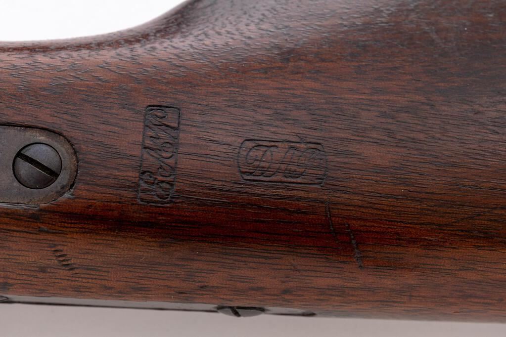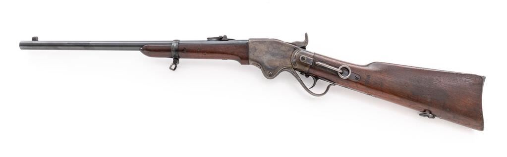 Civil War Spencer Model 1865 Saddle Ring Carbine, #20359, .52 Spencer cal., 20" round barrel marked "M 1865" at breech has standard carbine sights; receiver has maker's name, address, 1860 patent date and serial number at top, hammer marked "W", saddle ring/bar at left. Oil-finished walnut forend (marked "P") has single band with sling swivel, matching buttstock a crescent buttplate with removable 7-shot cartridge magazine tube, swivel at belly, "E.A.W." (E.A. Williams) and "D.A.P." (Dwight A. Perkins) inspectors' cartouches at left wrist. Mfg'd ca. 1863-65. Condition is near excellent retaining approx. 97% original military blue to barrel, lovely mottled case colors, smooth gunmetal having sharp edges and markings. Stocks are sound showing occasional light dings, sharp cartouches, pleasing color and finish. Action is crisp, original 6-groove bore is bright with sharp rifling and light frosting toward muzzle. Est.: $2,500-$3,500. (Antique)