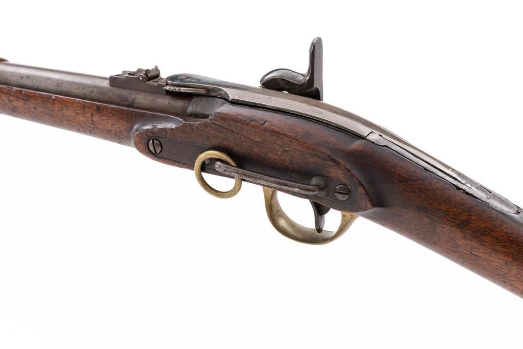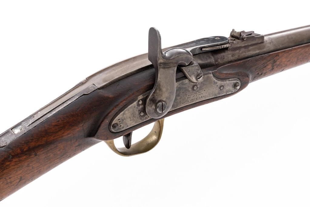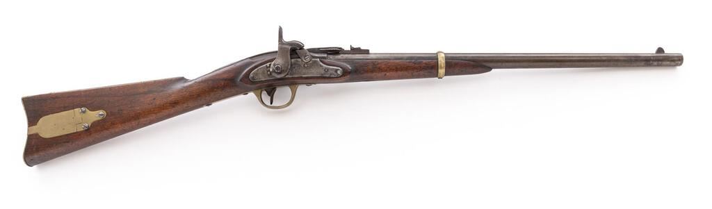 Civil War Merrill Breechloading Percussion Carbine, 1st Type, #8504, .54 cal., 22.1" round barrel with standard sights is unmarked; receiver has 8.25" rear-hinged breech-lever marked "J.M. Merrill Balto./Pat. July 1858" with articulated plunger to seat combustible cartridge in chamber, nipple bolster with cleanout screw; beveled lockplate has Merrill marking + "Apl. 9 May 21-26-61" below, serial number at rear. Brass trigger guard, 4.375" patch box, buttplate, screw-retained band. Oil-finished walnut halfstock has left-side "SWP" cartouche of Inspector Samuel W. Porter, splinter-type forend, 5.25" sling bar/brass ring at left. Condition is very good showing gray gunmetal with scattered oxidation (knackering at upper tang, breech lever hinge area), good edges and markings, toned brass. Stock shows age and use marks, shallow 1.75" gouge at bottom of forend, 1.25" crack above sling bar. Action is crisp, breech hinge is secure, bore shows scattered light roughness, fine rifling. Est.: $1,500-$2,500. (Antique)