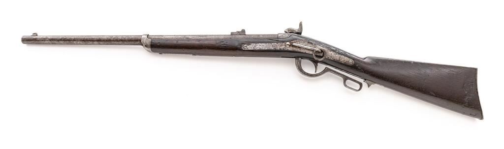 Very Rare Civil War Gibbs Breechloading Percussion Carbine, NVSN, .52 cal., 22" round barrel with standard blade front/2-leaf rear sights, marked "B" at left breech; receiver marked "L.M. Gibbs/Pat'd./Jan'y. 8, 1856" at top has flat lockplate marked "(federal eagle)" behind hammer, "Wm. F. Brooks/Manfr. New York/1863" ahead, cleanout screw at nipple bolster, finger-loop trigger guard/operating lever, sling ring/bar at left. Halfstock of oil-finished walnut has iron nosecap/barrel hinge with 4" lower tang, crescent buttplate marked "U.S." at top. Mfg'd 1863, in just 1,052 qty. Condition is good retaining no original finishes, being overall lightly-etched gray-brown gunmetal with fine edges/markings. Breech operates smoothly, locks up tightly, hinge is secure. Loose-fitting hammer is a modern replacement. Stock is sound, shows scattered moderate dings, 1.5" crack at left breech, added finish, lacks inspector's mark. Action is crisp, bore shows overall etching and fine rifling. Est.: $2,000-$3,000. (Antique)