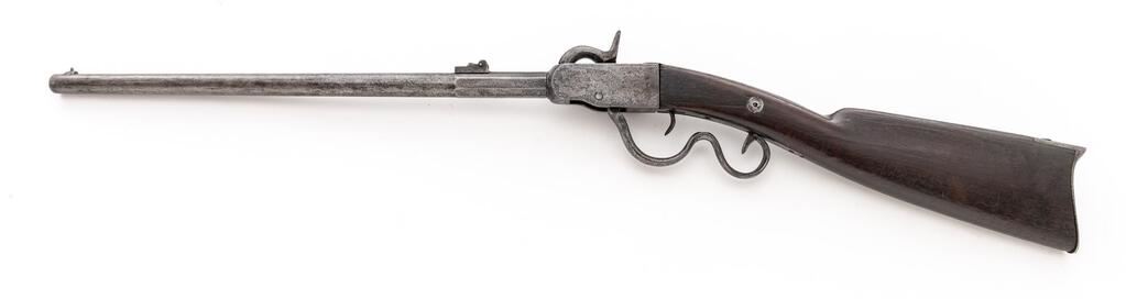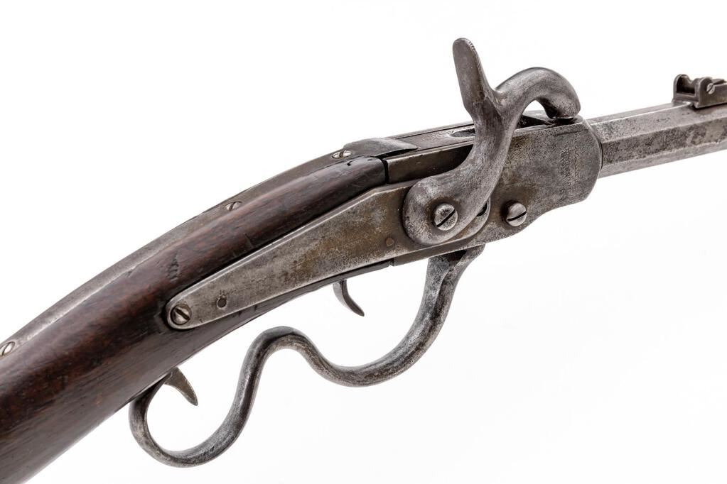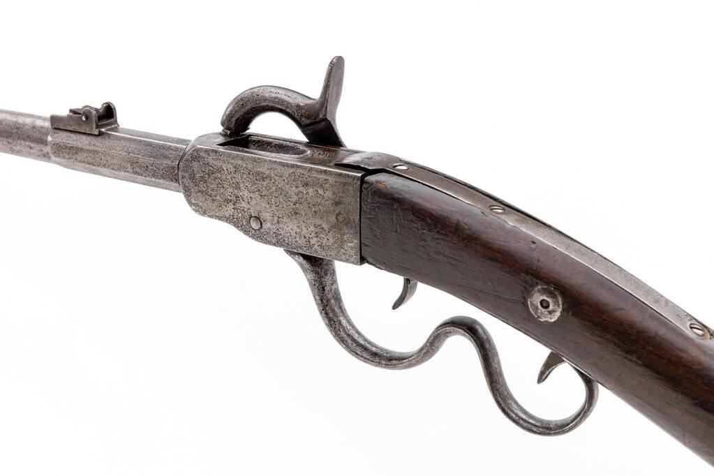 Civil War Gwyn & Campbell Breechloading Percussion Carbine, Type I, #99 (or 66), .52 cal., 20" round barrel, block-pin front sight, flip-up rear on 3.5" octagonal breech; 4.25" squared receiver has long serpentine trigger guard/operating lever, stamped "Union/Rifle" over an illegible mark at right, 5.5" back-action lockplate has long hammer curved to meet nipple. "Perch belly" buttstock of oil-finished walnut has crescent buttplate. Mfg'd ca. 1863-64. Condition is good retaining no original finishes but overall gray gunmetal showing scattered oxidation and light erosion (buttplate pitted), fine edges and markings. Sling ring/bar missing from right side. Stock is sound with scattered light marks, added varnish, lacks inspector's mark. Action is crisp, breechblock hinge secure, bore shows overall moderate erosion, fair rifling. Est.: $1,400-$1,800. (Antique)
