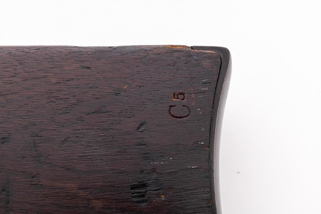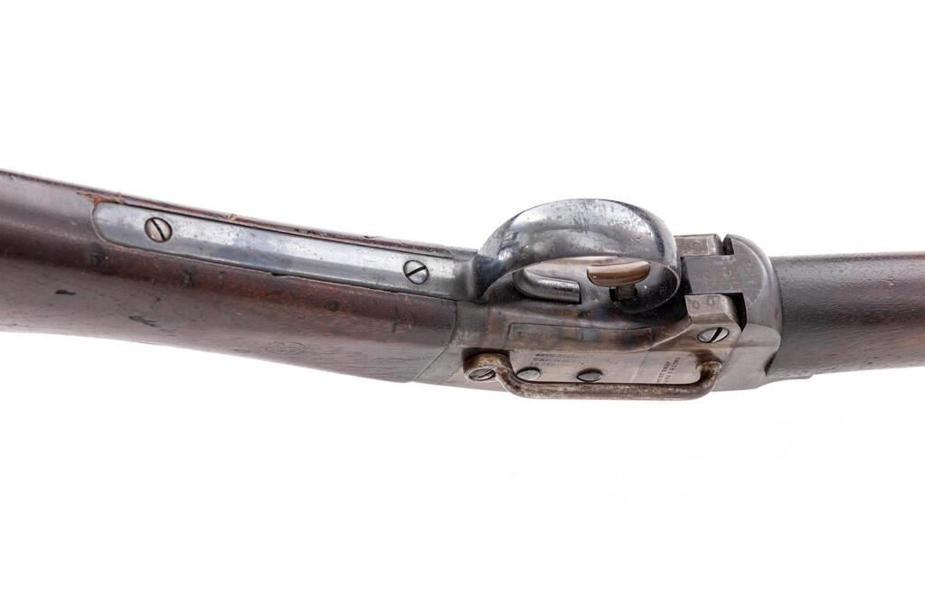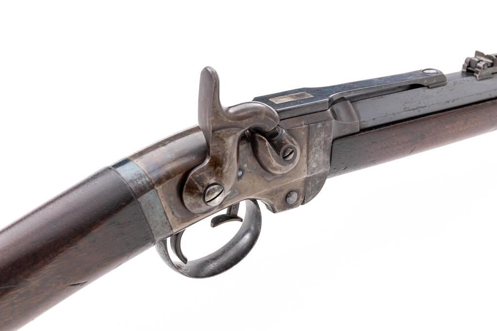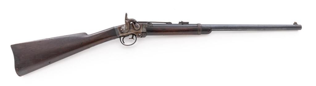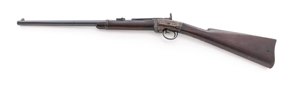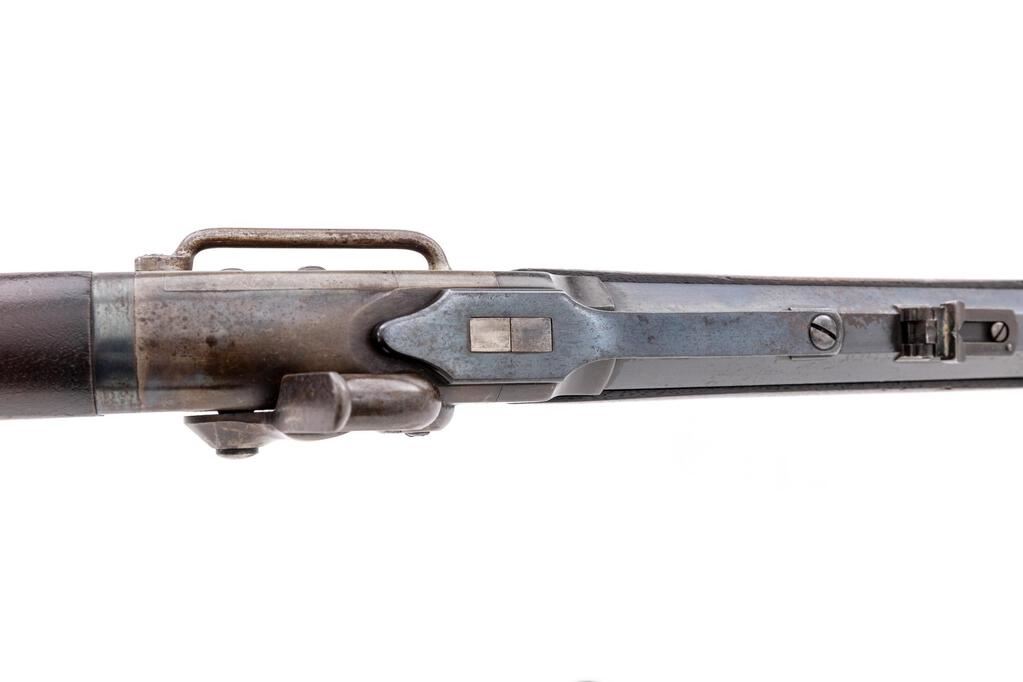 Low Serial Civil War Smith Breechloading Percussion Carbine, #0008, .50 cal., 21.6" round-to-octagonal barrel has 5.5" release bar at top that allows barrel to pivot downward for loading, "L.F.R." at breech; receiver has hinge at bottom-front, push-lever to release barrel, left-side sling bar, integral nipple bolster with cleanout screw, marked "Smith's Patent/June 23, 1857", "Address/Poultney & Trimble/Baltimore U.S.A.", and "Manufactured by/Am'n. M'ch'n. Wks./Springfield, Mass." at left. Oil-finished walnut forend, matching buttstock with oval "J.H." cartouche of Inspector John Hannis at left wrist, "C5" at left butt. Mfg'd ca. 1861-65. Condition is near excellent retaining approx. 98% military barrel blue (freckling on angled left flat at rear sight, deep glossy blue on barrel release bar and trigger guard/lower tang), softly mottled case colors, sharp edges and markings. Stocks are sound showing a few minor dings, slight chipping at toe of butt, sharp markings and most original finish. Lacks sling ring. Action is crisp, barrel hinge secure, bore brilliant with sharp rifling. Note low serial #0008. Est.: $2,500-$3,500. (Antique)