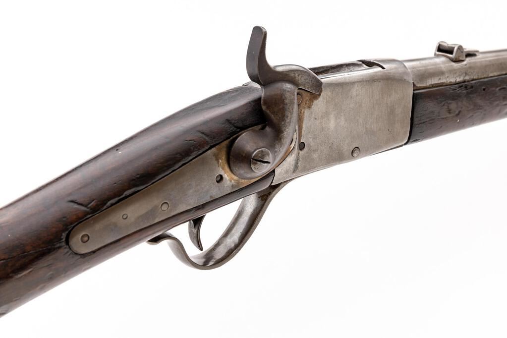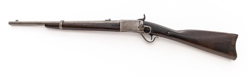 Antique Peabody Breechloading Carbine, by Providence (RI) Tool Co., NVSN, .50 RF cal., 20" round barrel, block-blade front and single-leaf rear sights; 4" receiver marked only "E" at top has serpentine trigger guard/operating lever, 5.25" back-action lockplate with military hammer, left-side sling ring/mount. Oil-finished forend has a single spring-retained band (marked "N"), matching buttstock with carbine buttplate. Mfg'd ca. 1866-71. Condition is good retaining no original finishes, being bright metal lacking all markings due to removal of heavy pitting. Buttstock shows 4" crack at left forward of buttplate, 3" crack behind lock, forend with 4.75" filler at former ramrod channel, both with dings from age and military use but sound. Action is crisp, bore shows overall light etching and fine rifling. Scarce, as most were sold to foreign militaries. Est.: $900-$1,200. (Antique)