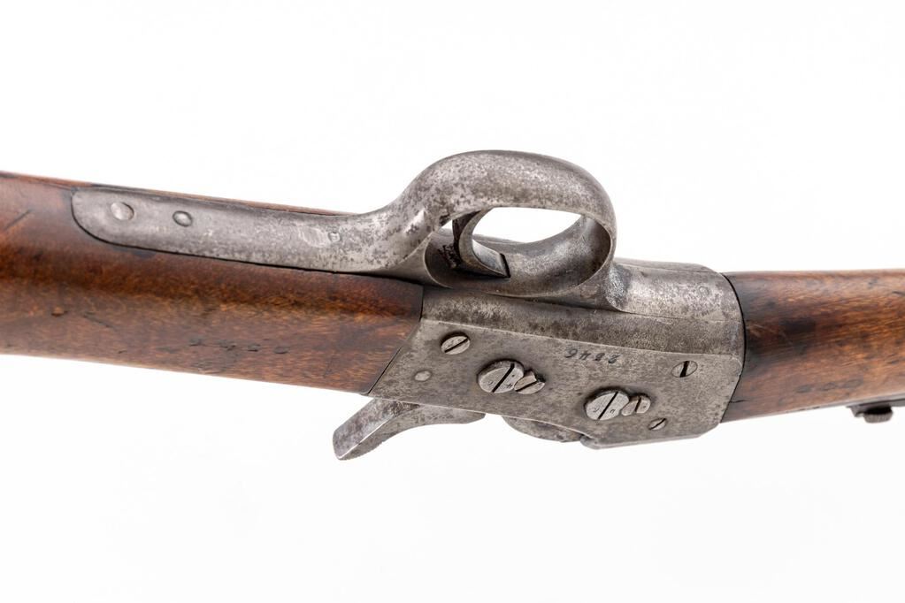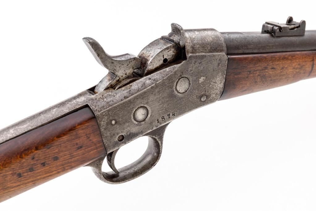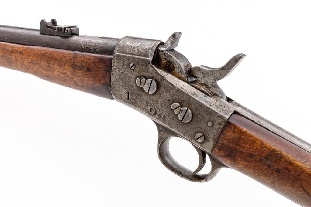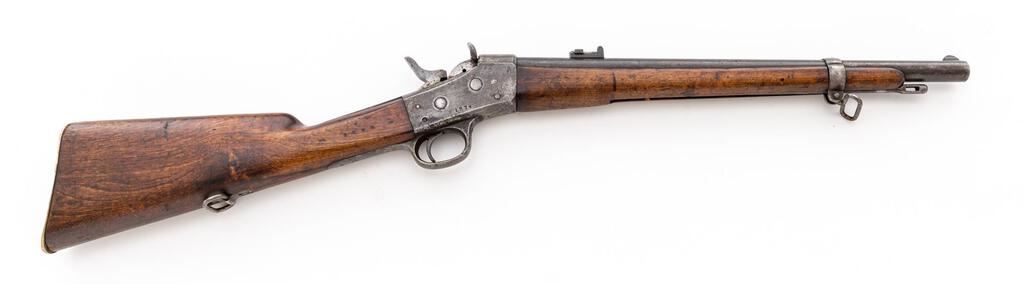 Antique Remington Rolling Block Single-Shot Carbine, #2346, .50 CF cal., 18" round barrel with carbine sights, marked "2346" and "G.P. JG" at breech; large No. 1 receiver with auto-extraction is marked "2346" at left, "1874" right; forestock of oil-finished walnut has a single spring-retained band with sling swivel, slotted ramrod, matching buttstock marked "1874" at right and "2346" at left has a vacant 1.25" circular brass plate inlet at left, brass buttplate marked "2346", sling swivel at belly. Mfg'd ca. 1874. Condition is very good retaining approx. 85% thinning blue and traces of case colors (but mostly silvered with scattered oxidation), toned brass. Stocks are sound and smooth with light marks. Action is crisp, bore is bright showing frosting in grooves, sharp rifling. Est.: $600-$900. (Antique)