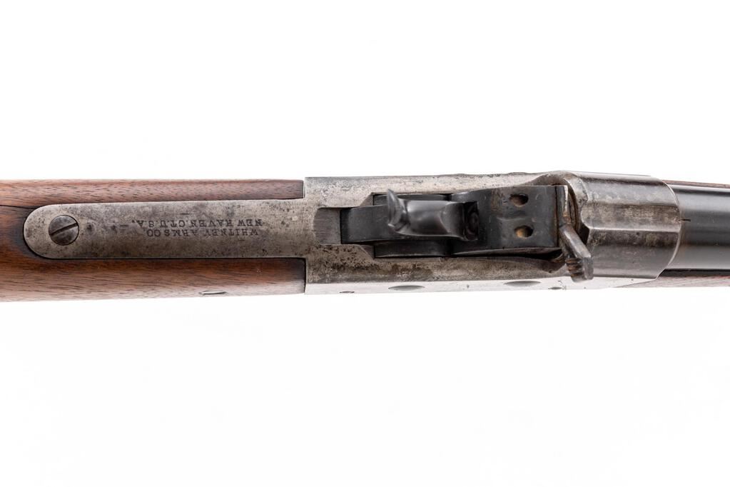 Rare Whitney-Remington Type II Rolling Block Shotgun, #84885, 20 ga., 32" tapering round barrel has shotgun-style bead front sight; rolling-breechblock receiver marked "Whitney Arms Co./Whitneyville, CT, U.S.A." at top tang, serial number below, with auto extraction. Oil-finished walnut forend/buttstock, carbine buttplate. Mfg'd 1881-88 in less than 1,000 qty. Condition is very good retaining approx. 85% thinning and toning barrel blue, silvering case colors, sharp edges and markings. Stocks are sound and smooth, there being a secure 4" hairline at left comb reinforced by two thru-rivets. Action is frozen, breechblock may have had a repair, clean bore shows overall light frosting. This shotgun is a very rare Whitney rolling block variation. Est.: $600-$800. (Antique)