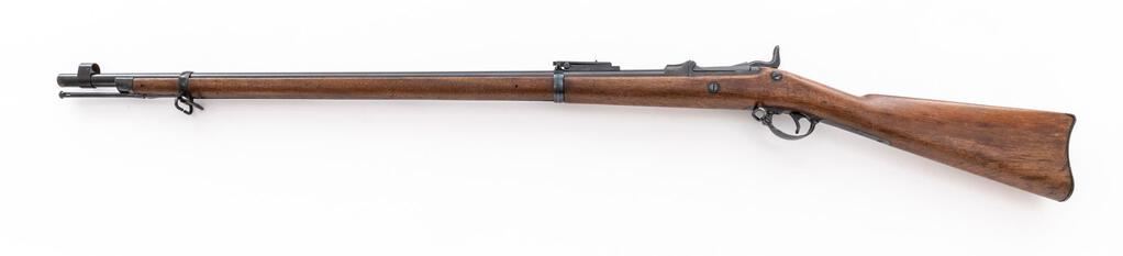 Springfield Model 1884 Trapdoor Single-Shot Infantry Rifle, #370412, .45-70 Gov't. CF cal., 32.62" barrel has standard markings, Buffington long-range rear sight marked "R" and front sight with detachable oval hood; low-arch trapdoor marked "US/Model/1884"; flat lockplate with standard markings, oil-finished fullstock has vestigial "SWP/1891" (?) inspector's cartouche at left, 2-pc. trigger guard with swivel, grooved trigger, curved buttplate marked "US", 2 spring-retained bands (top with stacking swivel), nosecap, slotted ramrod. Mfg'd ca. 1886-91. Condition is fine retaining approx. 90% smooth armory blue, sharp edges and markings (trapdoor appears refinished). Stock is sound and smooth having minimal marks, fine finish. Action is crisp, bore is brilliant with sharp rifling. Est.: $800-$1,200. (Antique)