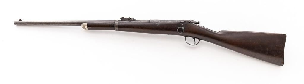 Antique Winchester-Hotchkiss Bolt Action Saddle-Ring Carbine, 2nd Type, #6536, .45-70 CF cal., 24" round barrel, pinned block-blade front and wind gauge rear sight; long receiver marked "6536" and "HN" at left rail, maker's name, address and 1860-1877 patent dates in 3 lines at left, has 7" sliding bolt with knurled rear knob, rear safety at top left, mag. cutoff at right. Oil-finished walnut halfstock has internal magazine, steel trigger guard and buttplate, nickeled nosecap with door to 2-pc. cleaning rod (present). Mfg'd early 1880s. Condition is good retaining traces of original blue, darkened case colors, fine edges and markings. Stock is sound and smooth with usual use marks (.625" wood loss at forend), 5.5" repaired crack at right-rear receiver. Bolt is smooth. action is crisp, bore shows moderate erosion, good rifling. Est.: $900-$1,200. (Antique)