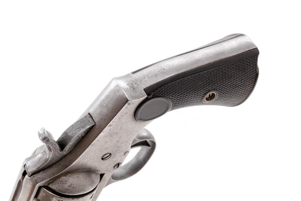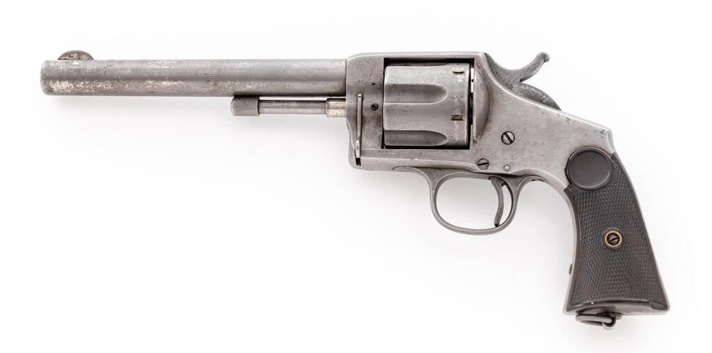Hopkins & Allen "XL No. 8" Single Action Army Revolver, #105, .44-40 CF cal., 6.75" round barrel, fluted 6-shot cylinder, solid frame marked "Hopkins & Allen Mfg. Co./Pat. Mch 28, 71 May 27, 79" and "XL No. 8" on topstrap has left-hand release for sliding ejector rod, integral "saw-handle" straps with lanyard ring at butt, 2-pc. checkered hard rubber grips. Mfg'd late 1870s-early ?80s, in very small qty. Condition is good retaining traces of original finish else smooth gray gunmetal having occasional light erosion, sharp edges and markings. Grips are sound showing only light wear, tiny fleabite and .25" chip at left butt. Action does not hold cock, bore shows light erosion, fine rifling. Est.: $800-$1,200. (Antique)