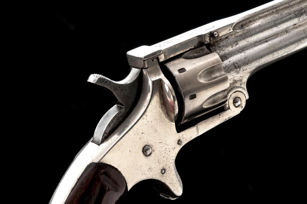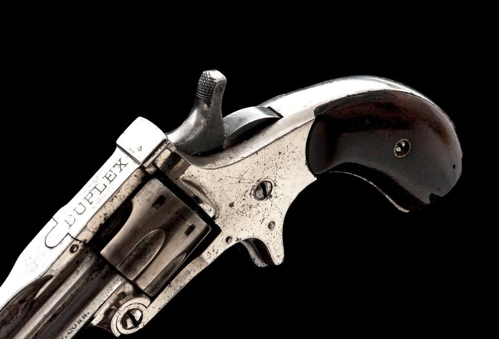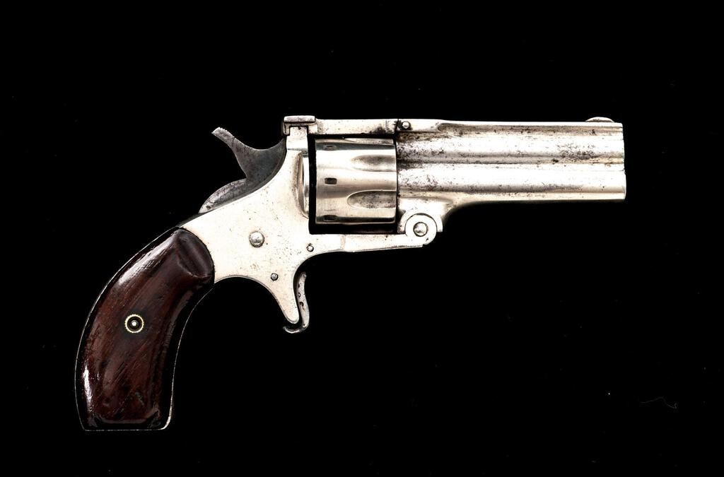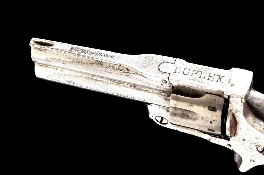 Osgood Gun Works Duplex Over/Under Revolver, NSNV, .22 cal. Upper/.32 cal. Lower ribbed barrel, 2.5" ribbed tip-down barrels, blade front and fixed rear sights, nickel finish, spur trigger, smooth wood two-piece square butt grips, 8-shot cylinder for .22 barrel and single shot cylinder for .32 barrel. Top of the barrel rib is marked "PAT'D DEC. 7 1880"; top strap is marked "DUPLEX". Left side of the lower barrel is marked "OSGOOD GUN WORKS NORWICH, CONN." Revolver is in near fine overall condition retaining a significant amount of frosted nickel finish, with light surface erosion and edgewear. Hammer and trigger show old muted case hardening. Smooth wood grips are very good with a couple small dents at the base of each grip. Bores are fair with some roughness, and the action functions well on this unique antique revolver. Est.: $700-$900. (Antique)