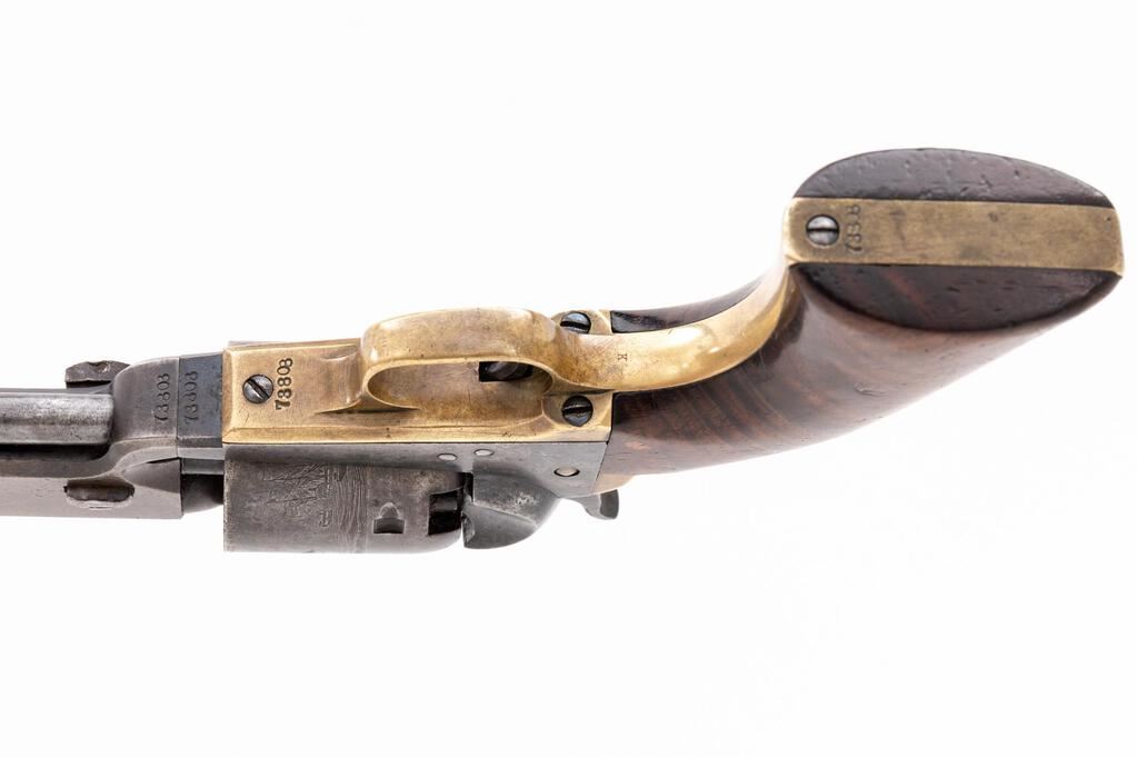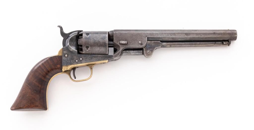 U.S. Marked Colt Model 1851 Navy Late Third Model Single Action Percussion Revolver, #73808, .36 cal., 7.5" octagon barrel with brass pin front and fixed rear sights, blue and case hardened finish with brass grips straps, smooth one-piece walnut grips, small brass trigger guard. Mfg'd 1857. Revolver is in fine overall condition retaining 15%-20% original toning blue finish drifting to gray patina. Barrel shows sharp edges with original finish under the loading lever and in protected areas. Left side of muzzle shows holster wear smoothing the sharp edges. The New York barrel address is crisp. Loading lever and frame show considerable original case coloring, with the loading lever assembly being the sharpest. Frame retains considerable original muted smoky case color. Left side of frame has a sharp "COLTS PATENT U.S." martial marking with military acceptance marks. Screw heads are very good and all visible serial numbers are matching, including the arbor and wedge. Wedge shows significant original finish. Cylinder retains approx. 25%-30% original toning blue drifting to patina, with 85%-90% of the naval scene retained and a legible engagement date. All six of the safety pins are intact and the nipples are good. Hammer shows light surface erosion and oxidation due to powder exposure and use, with some knackering around the wedge from rough disassembly. Brass grips straps and large trigger guard all show a pleasing patina. Walnut grips are very good with a crisp "ADK" (Andrew D. King) cartouche on the left grip and a faint outline of a cartouche still visible on the right. Grips are better than average walnut with some burl figure and have the matching pen and ink serial number in the grip channel. Action is crisp and the timing is very good; bore is good with some roughness and well-defined rifling. This is a most acceptable martially marked Navy retaining considerable original finish while displaying marks consistent with carry and use. Est.: $4,000-$6,000. (Antique)