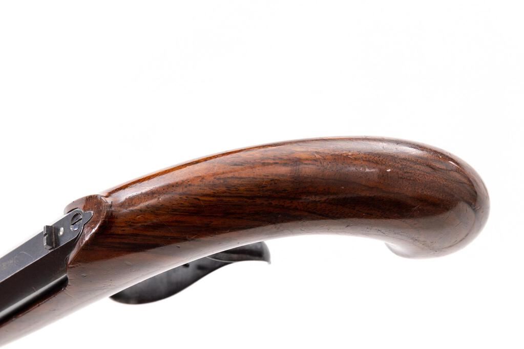 Antique Swiss Single-Shot Salon Pistol, by Jean Siber of Lausanne, NVSN, 4mm, blued 3.5" octagonal barrel made integral with 4" breech (marked "Jean Siber",) has a 1" opening for sliding striker that is manually thumb-cocked, then capped and fired using the conventional trigger. Halfstock of varnished walnut has bag grip, spurred trigger guard, and Schnabel nose. Condition is excellent retaining approx. 98% deep blue, sharp edges and markings. Stock shows minor handling marks, lovely grain, color, and most original varnish. Action is crisp, bore is clean having fine spiral rifling. Siber and his family were Swiss watchmakers, and their quality and detail show. Est.: $800-$1,100. (Antique)