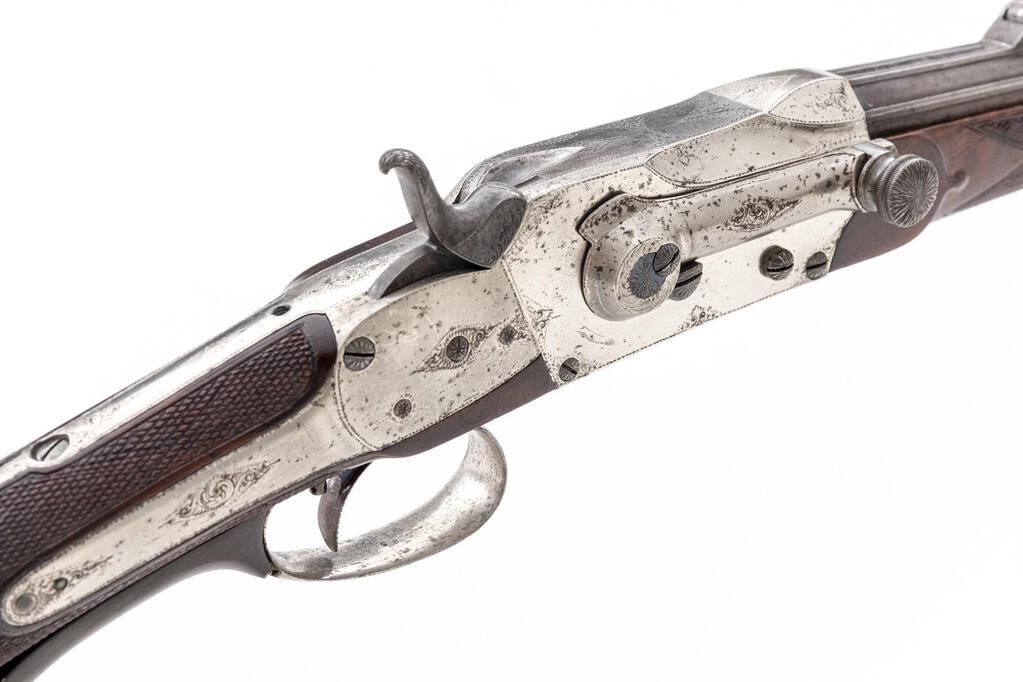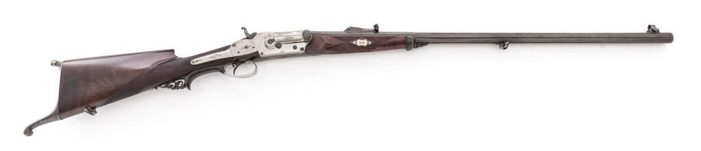 Antique Single-Shot Martini Type Schuetzen Target Rifle, by Olsen-Maseng of Askim, Norway, NVSN, 8mm CF cal., 29'' deeply-fluted octagonal barrel has hooded Beach front and elevation adjustable sliding-leaf rear sights, silver-inlaid "Olsen-Maseng, Askim" at breech; nickel-plated and engraved receiver has 180-degree lever at right that drops open the case hardened breechblock, right-offset hammer, adjustable single set trigger. Top tang threaded for sight (not present). Finely carved and checkered walnut buttstock and forend have scroll-carved horn trigger guard and Schnabel cap, steel Swiss buttplate having removable ball-tip rod. Condition is fine retaining approx. 80% thinning and toning blue to barrel, 92% original toning and lightly flaking nickel to receiver and trigger guard. Stock is sound and smooth showing sharp checkering and carving, lovely grain, color and satin finish. Action is crisp, bright bore shows light frosting and sharp rifling. An unusual and rare Norwegian-made Schuetzen rifle. Est.: $1,800-$2,400. (Antique)