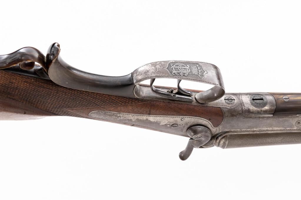 Fine Mid- to Late 19th Century Viennese Cartridge Double Rifle, by Albert Staehle (k.k.Hos Buchsenmacher in Wien), all of which is marked to top of matted rib, #1472, .62 cal., 24'' rifled Damascus barrels, case hardened frame and back lock, right lock marked ''Staehle'' behind hammer; left lock ''in Wein'', with checkered walnut patchbox stock and horn back trigger guard and underlever. Trigger guard is marked with crown-''CR'' royal cipher. It is interesting to note that the ''k.k.'' marking to barrel rib represents pre-1867 royal warrant as a gunsmith to the court of Austria. Crown-''CR'' cipher to bottom of trigger guard is consistent with personal items belonging to Crown Prince Rudolph of Austria (1858-1889). Rudolph was the only son of Emperor Franz Joseph I of Austria and Empress Elizabeth and the heir to the combined throne of the Austrian/Hungarian Empire, who died under mysterious circumstances with his mistress while on a supposed hunting trip. Condition is fine to near excellent with thinning and light general toning to Damascus barrels; case hardened portions have silvered somewhat. Stock retains sharp checkering and shows evidence of a professional period accomplished butt extension. Action remains crisp, bores are excellent. Est.: $2,500-$3,500. (Antique)