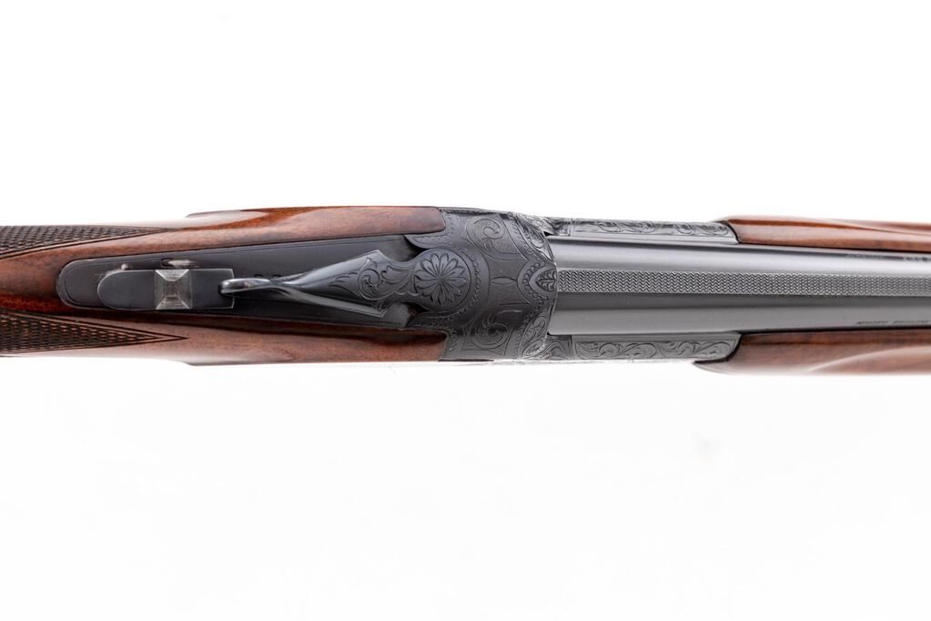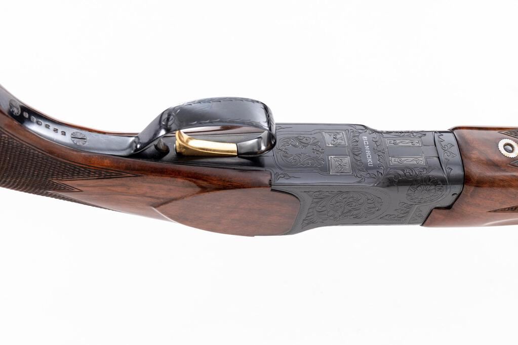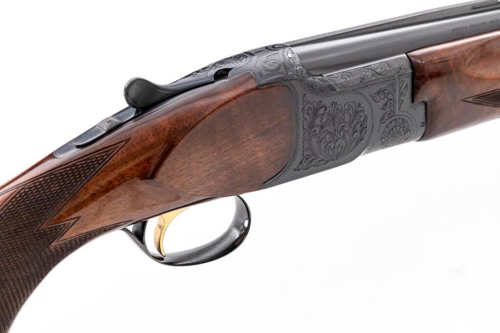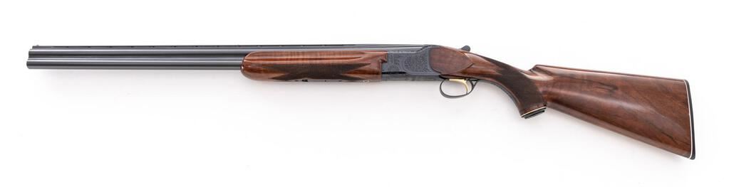 Charles Daly/Miroku Venture Skeet Grade Over/Under Shotgun, #523088. 20 ga. 26" narrow vent rib barrels have target beads, 3" chambers, and are choked Skt/Skt. The boxlock action is similar to a Browning Citori, and features a gold single selective inertia trigger, non-automatic safety, and auto ejectors. The blued receiver is nicely hand-engraved in floral patterns with punch-dot borders. The finger groove semi-beavertail forend and pistol grip buttstock are "B" Grade walnut, high-gloss finished, with adequate checkering, Whiteline black plastic grip cap, and "B.C. Miroku" marked buttplate. Stock dimensions are 14"x1-1/2"x2-1/2". Mfg'd late 1960s by Miroku in Japan for Charles Daly. Condition is near excellent, approx. 95%, showing very little use. Action still locks tight and functions correctly, except that the lower ejector will operate on opening even if the trigger is not pulled, which can be repaired by a qualified gunsmith. Little wear to checkering; bores are bright. Est.: $900-$1,100. (C&R)
